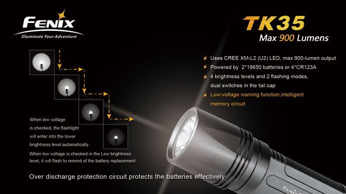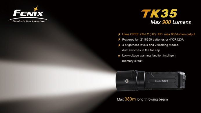Фонарь Fenix TK35 Cree XM-L2 U2 LED из линейки Fenix тактических фонарей. Это прекрасный поисковый фонарь, самый мощный и новый фонарь в линейке. Это первыйфонарь на новейшем диоде XM-L2 U2 . У фонаря всего одно резьбовое соединение, что улучшает его водонепроницаемость. Свет фонаря заливной. И довольно дальнобойный. Это прекрасный выбор для любителей прочных и ярких фонарей.