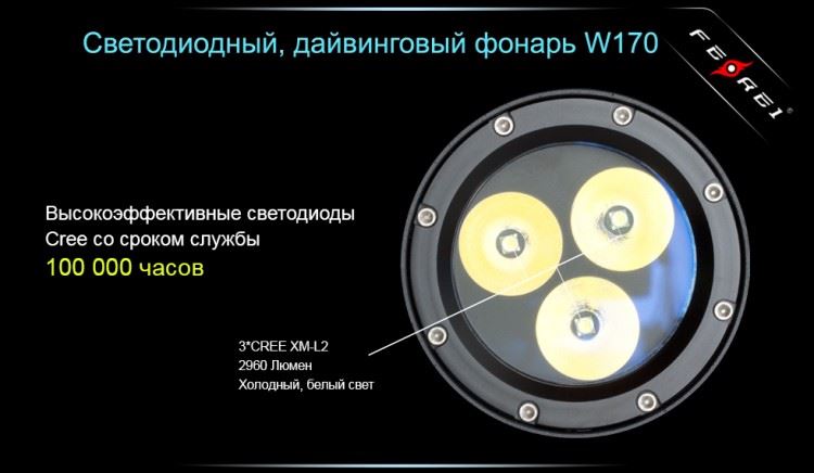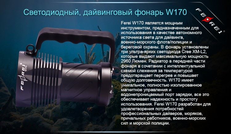 Высококачественный фонарь большой мощности для дайвинга W170 от бренда Ferei. В модели используется светодиод CREE XM-L2, имеющий большой ресурс работы и обеспечивающий световой поток 2960 люмен. Свечение холодного оттенка подводного фонаря W170 прекрасно подходит для применения в воде. Фонарь имеет три уровня яркости и может работать в режиме стробоскопа. Для обеспечения максимальной защиты от проникновения воды в модели W170 используется двойное уплотнение резиновыми кольцами, которое обеспечивает работу фонаря на глубинах до 500 метров. Термозакаленное стекло способно выдерживать высокое давление воды на большой глубине. Фонарь имеет цифровую регулировку яркости – по мере уменьшения заряда батарей специальный контроллер автоматически поддерживает стабильную яркость свечения светодиода. Система предупреждения сигнализирует о низком заряде батареи. Вращающийся магнитный переключатель на герконе обеспечивает надежную работу фонаря на любой глубине.