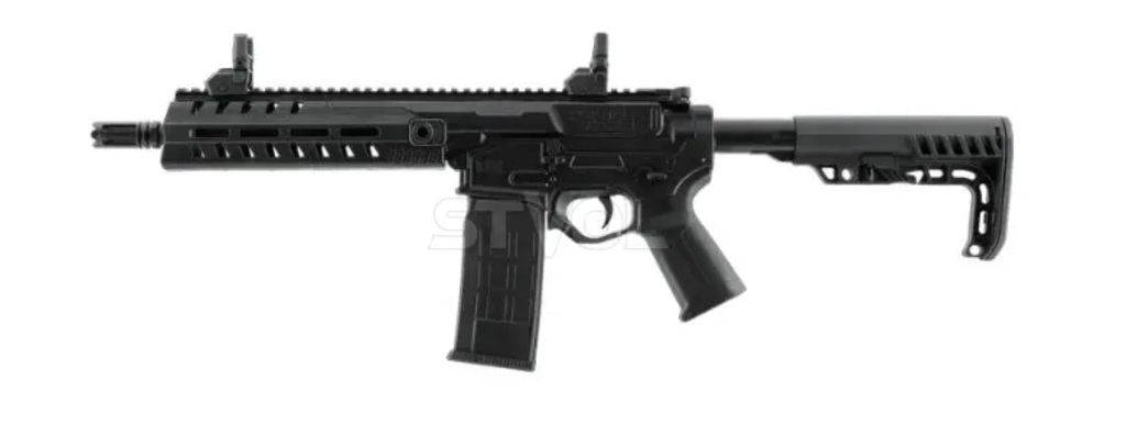 Umarex UX Strike Force — это пневматическая винтовка калибра 4,5 мм (.177), работающая на CO2, выполненная в тактическом стиле AR-15. Она предлагает как полуавтоматический, так и полностью автоматический режимы стрельбы, что делает ее привлекательной для развлекательной стрельбы, плинкинга и тренировок. UX Strike Force разработана с акцентом на реалистичный внешний вид и ощущение, напоминая современную спортивную винтовку AR-15. Корпус изготовлен преимущественно из черного полимера. Она оснащена регулируемым прикладом в стиле SBR, цевьем с слотами M-LOK для крепления аксессуаров и полноразмерной верхней планкой Пикатинни для установки оптики. В комплекте идут съемные откидные оптоволоконные прицельные приспособления с регулировкой по вертикали и горизонтали. Ствол имеет резьбу M14x1 (левая) для установки глушителя или ДТК (муляж ДТК установлен). Элементы управления также выполнены в стиле AR-15, включая функциональный рычаг взвода, затворную задержку и двухсторонний переключатель огня. В комплект входят сменные накладки на рукоятку (3 размера). Общая длина: 688 мм (приклад сложен), 768 мм (приклад разложен). Длина ствола: 10" (примерно 254 мм). Двухсторонний переключатель огня (Safe / Semi / Full-Auto) будет удобен как правшам, так и левшам. Гнезда для быстросъемных антабок (спереди и сзади) позволяют установить ремень. Винтовка питается от двух 12-граммовых баллончиков CO2, которые размещаются в магазине. Съемный магазин вмещает 30 стальных шариков BB калибра .177.