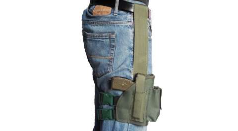 Кобура для открытого ношения пистолета на бедре с дополнительным креплением к поясу. Отличительной особенностью данной модели от конкурентов, это использование двух регулируемых резинок толщиной 3,5 см каждая с застежками фаст для крепления к бедру. Это дает возможность удобно разместить ее и самое главное не будет стеснять ваших движений, ведь подобная кобура используется чаще всего при выполнении тактических задач. К ремню она крепится с помощью стропы с липучкой. Липучка имеется по всей длине стропы, по этому есть большой диапазон выбора высоты размещения на бедре. То есть она подойдет под любой рост и окружность бедра. Наружный подсумок используется для хранения запасного магазина.