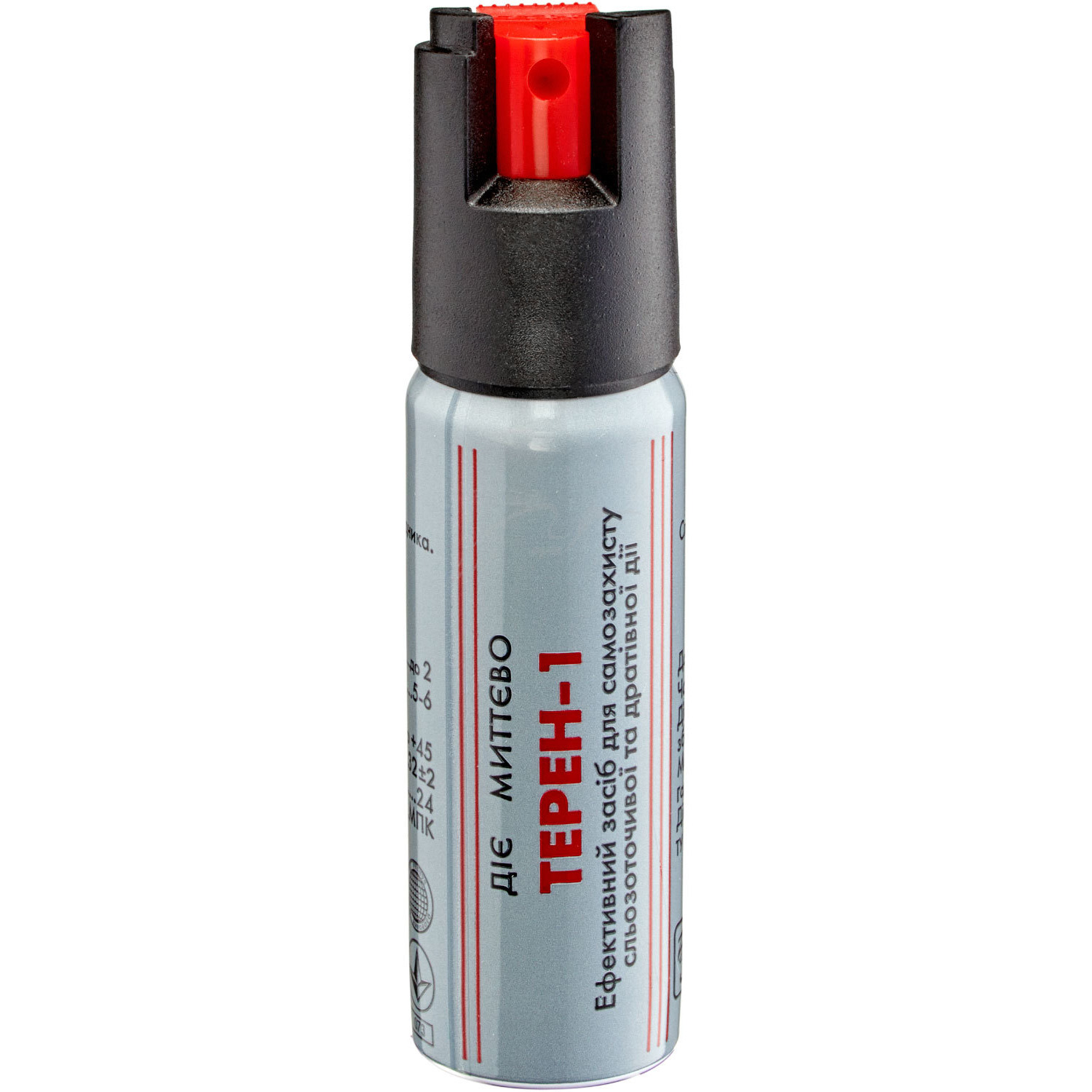 ОПИСАНИЕ: Изделия "Терен-1М" (ТУ У 29.6-19485052-019-2002) предназначены для использования гражданскими лицами в качестве средства самозащиты и представляют собой баллоны аэрозольного типа, заполненные препаратом, содержащим вещество слезоточивого и раздражающего действия (ирритант) - морфолид пеларгоновой кислоты. Препарат оказывает воздействие «конусом» аэрозольного облака, он эффективен при применении как против лиц, находящихся в состоянии алкогольного опьянения, так и против собак. Изделия являются однофункциональными, невосстанавливаемыми и неремонтируемыми. Применяемый состав не разрушает озоновый слой.