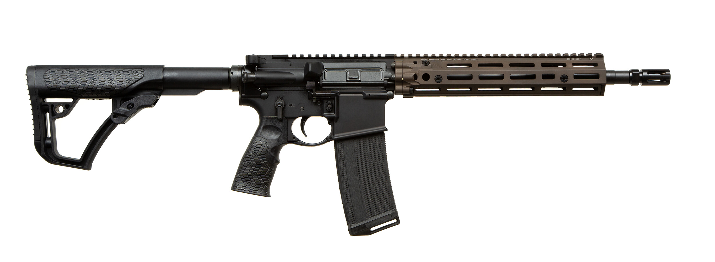 Новинка от компании Daniel Defense- карабин DD4 с цевьём RIS III и длиной ствола 12,5"! Нарезной карабин от компании Daniel Defense DD4 RIII в калибре 223 REM имеет полностью двусторонние органы управления, что позволяет стрелкам-левшам и правшам управлять затворной задержкой, предохранителем и сбросом магазина без необходимости перемещать или убирать свою доминирующую руку с рукоятки карабина. Рукоятка для зарядки GRIP-N-RIP также двусторонняя. Компания Daniel Defense взяла цевьё RIS II, используемое на оригинальном M4A1, и заменили ее на 10,5-дюймовое цевьё RIS III с креплением M-LOK для облегчения веса. DD4 RIII построен на основе 12,5-дюймового ствола Cold Hammer Forged с установленным пламегасителем Daniel Defense. Эта винтовка также поставляется с эргономичными прикладом и пистолетной рукояткой Daniel Defense. Материалы и конструкция: Нижний ресивер: запатентованная конструкция с расширенной шахтой магазина, полностью двусторонними органами управления и точкой крепления QD на задней части ствольной коробки. Изготовлено на станке с ЧПУ из алюминия 7075-T6, твердое анодированное покрытие типа III. Верхний ресивер: Mil-Spec, изготовлен на станке с ЧПУ из алюминия 7075-T6, твердое анодированное покрытие типа III. Ствол: хромомолибденовая ванадиевая сталь 4150, холодная ковка, твист 1:7, профиль M4 . Длина ствола 12,5", хромированая обработка канала ствола. Газовая система: низкопрофильный газовый блок со штифтами, изготовленный на станке с ЧПУ из закаленной стали 4140 с тяжелым фосфатным покрытием, отвечающим требованиям MilSpec. Длина газовой системы Carbine-Lenght. Пламегаситель Daniel Defense выполнен из нержавеющей стали 17-4 PH, обработан нитридным покрытием. Дульная резьба 1/2-28" UNEF. Затворная группа: Профиль M16, испытания Mil-Spec MP, хромированное покрытие. Буфер: H Буфер. Цевье: Daniel Defense RIS III 10,5", запатентованная система болтового крепления с 6 болтами, выполнено из алюминия 6061-T6. Рукоятка взвода: GRIP-N-RIP, корпус изготовлен на станке с ЧПУ из алюминия 7075-T6, ручки и защелка изготовлены на станке с ЧПУ из алюминия 6061-T6, прочные роликовые штифты из нержавеющей стали, твердое анодированное покрытие типа III Труба приклада:Mil-Spec, сделана из алюминия 7075-Т6. Приклад: производства Daniel Defense, стеклонаполненный полимер с мягким на ощупь покрытием. Приклад зафиксирован в положении с максимальной длиной. Пистолетная рукоятка: производства Daniel Defense, стеклонаполненный полимер с мягким на ощупь покрытием. В комплекте 1 магазин на 32 патрона. Общая длина карабина 810 мм, вес 2,58 кг.