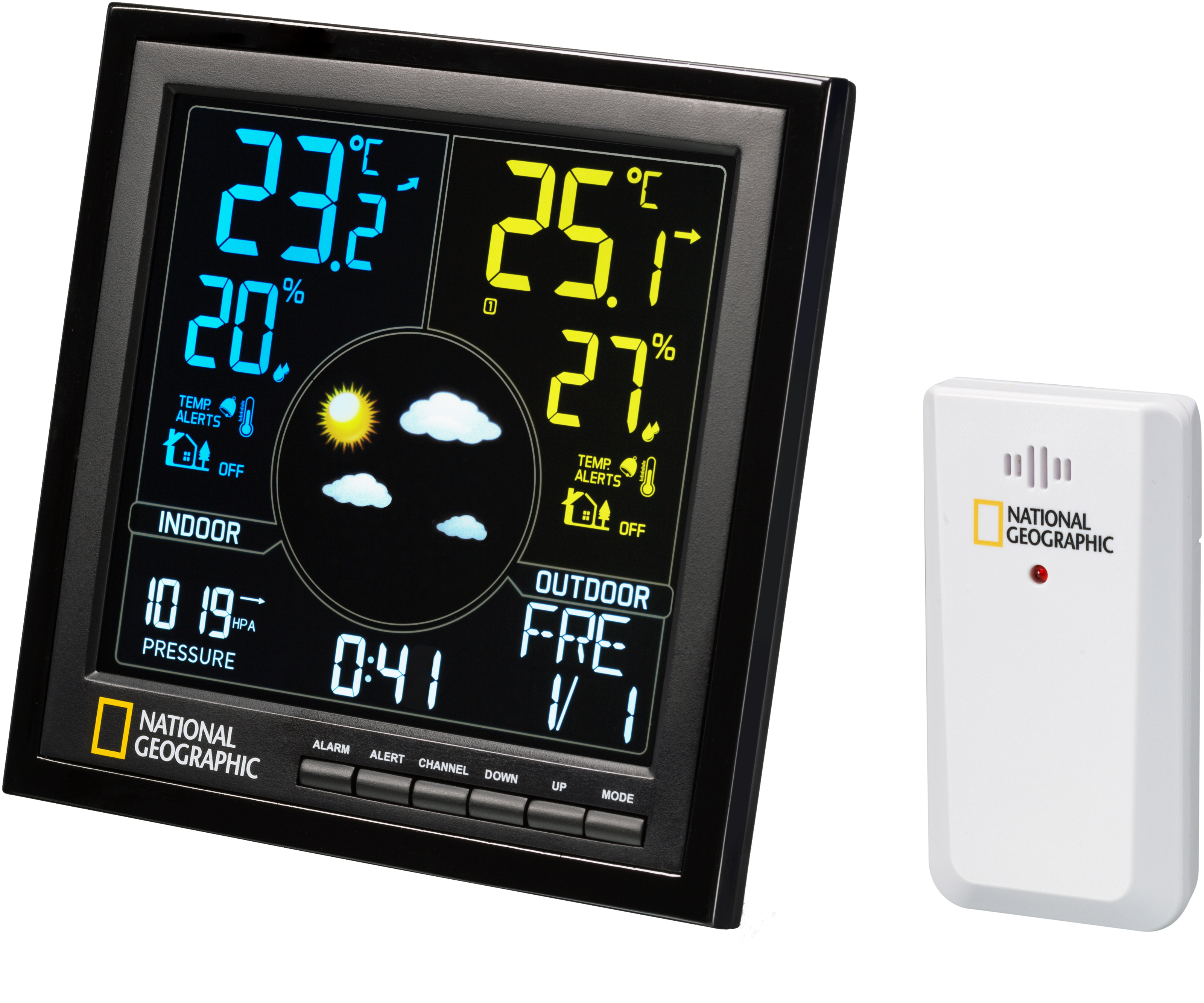 Метеостанція National Geographic VA Colour (Black) (9070600) завдяки кольоровому дисплею LCD та зовнішньому датчику показує вам всю важливу інформацію про погоду. На дисплеї виводиться не лише інформація про внутрішню та зовнішню температуру та вологість, але й точний час DCF, який отримується за допомогою радіочастотного передавача. Також відображається поточний день тижня і дата.