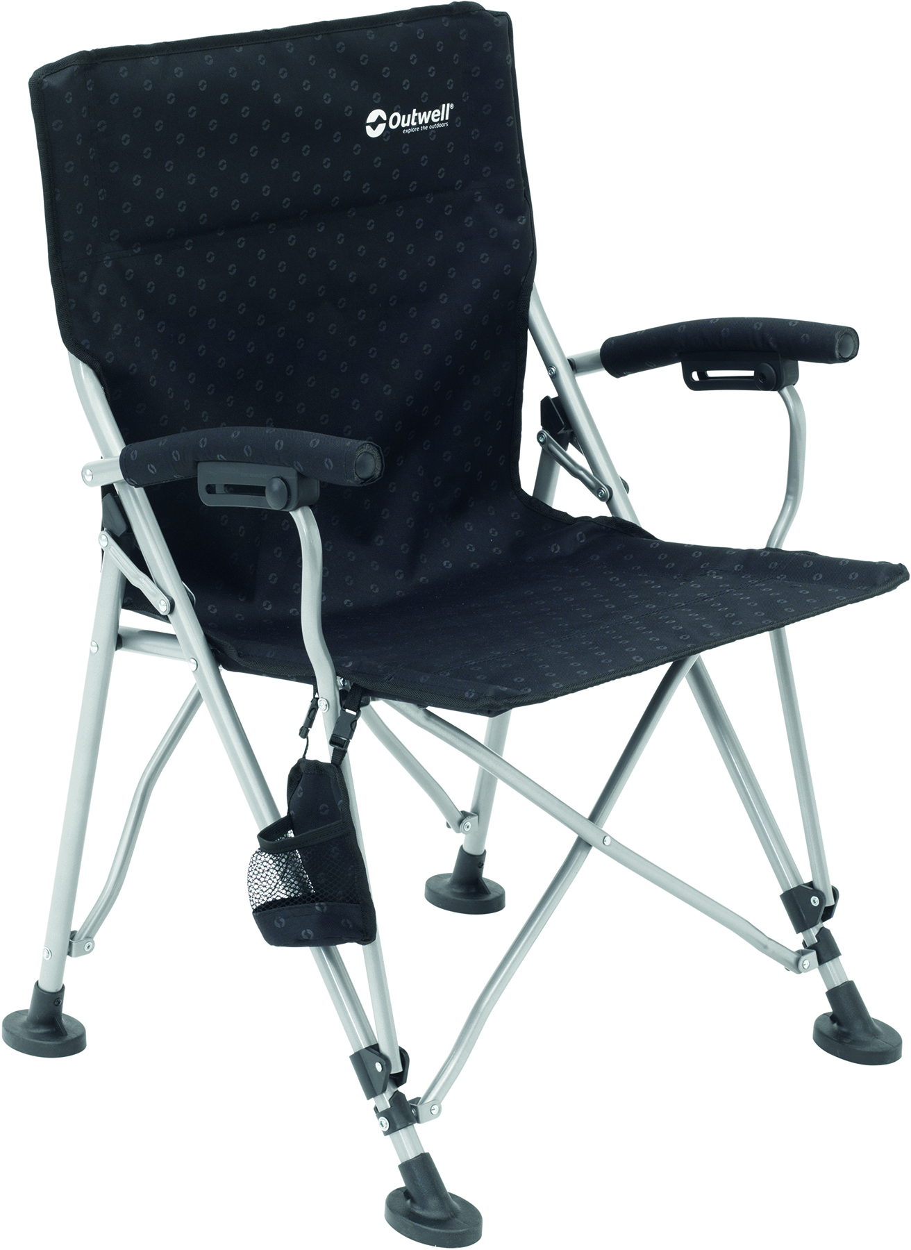 Outwell Campo Black (470233) - розкладний стілець із м'якими підлокітниками та знімним підстаканником. Каркас виготовлений із високоміцної сталі з порошковим фарбуванням та витримує навантаження до 125 кг. Збільшені опори ніжок підвищують стійкість на м'якому ґрунті. Чохол для перенесення полегшує транспортування та забезпечує компактне зберігання, коли стілець не використовується.