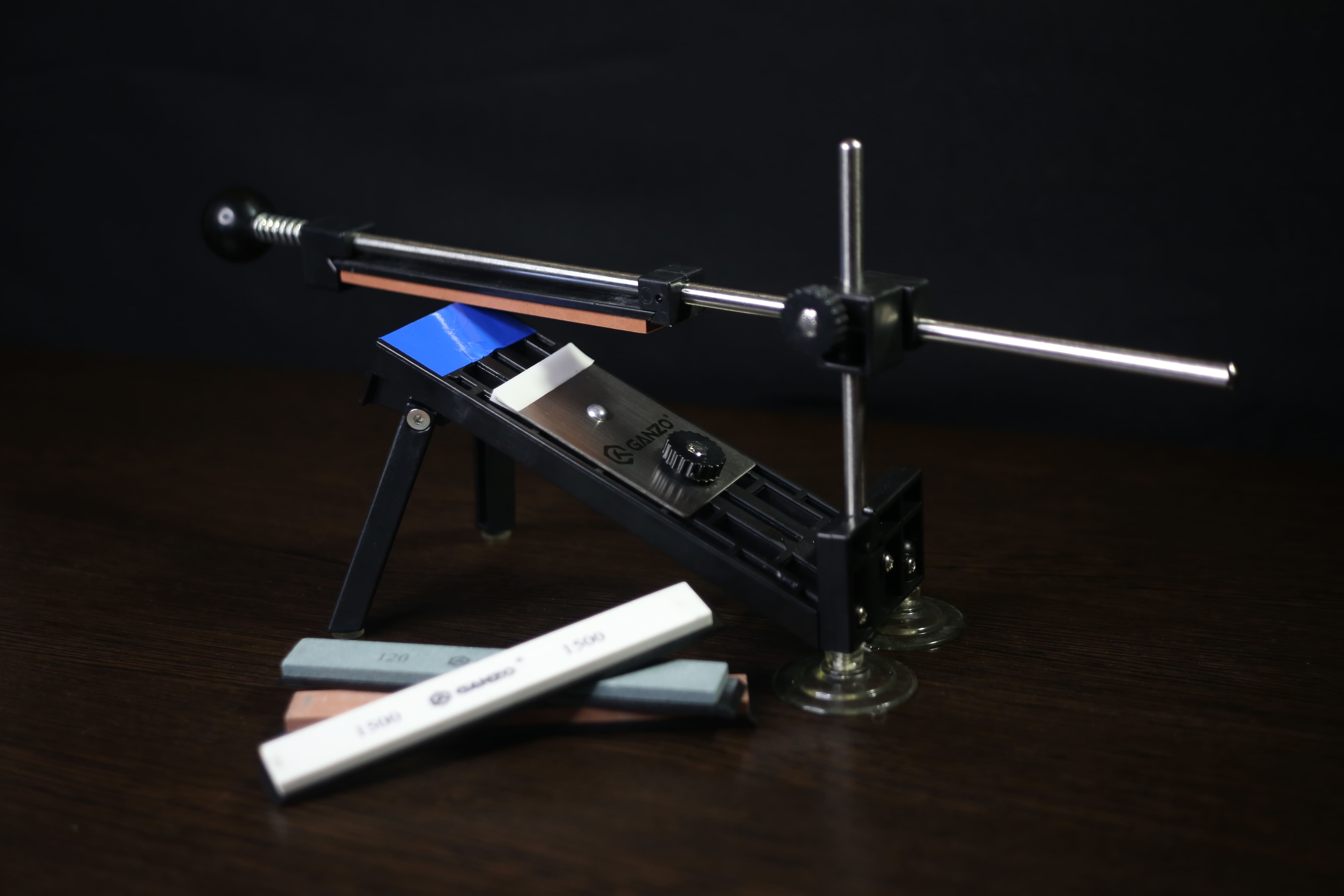 У комплектацію точильного верстата Ganzo Touch Pro входить підстава з усіма необхідними фіксаторами і напрямними, набір брусків різної зернистості і фірмовий чохол-органайзер для зберігання всіх деталей. Щоб виконати заточку, необхідно встановити верстат на робочу поверхню і зафіксувати за допомогою присосок, а потім виставити направляючу під необхідним кутом і встановити камінь відповідної грітності на опору.