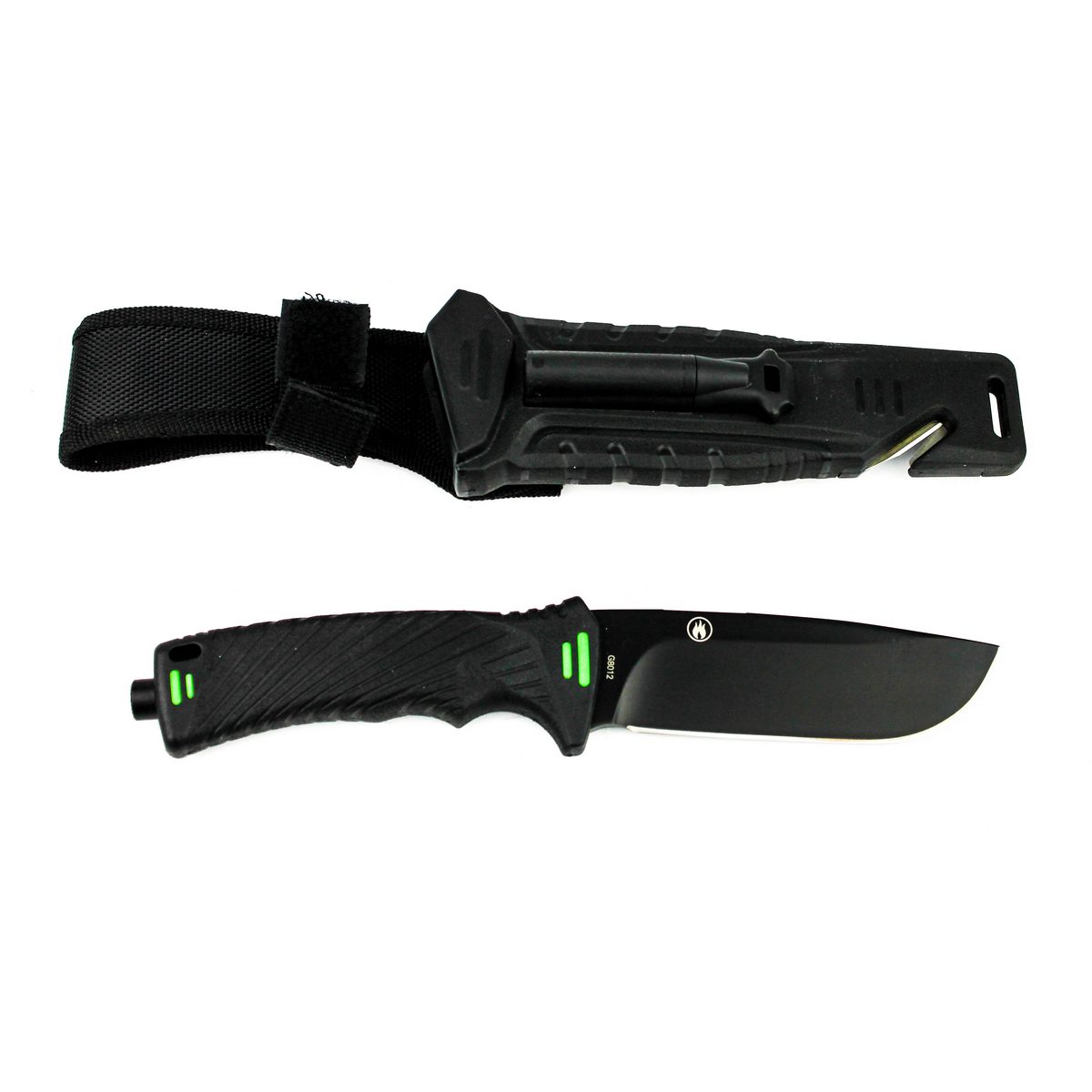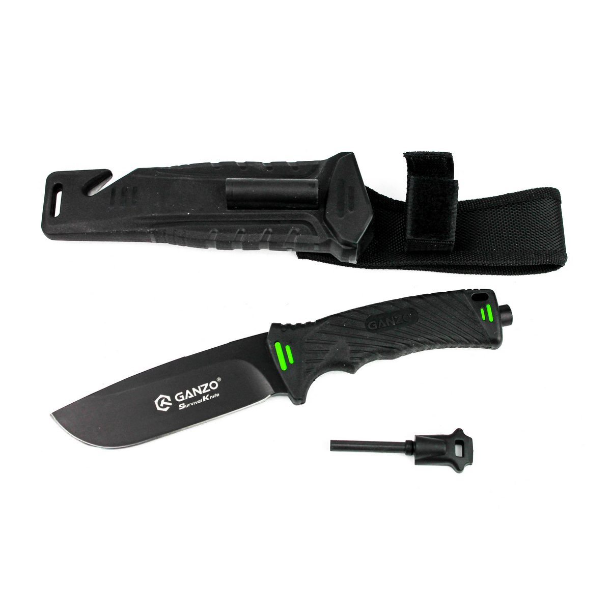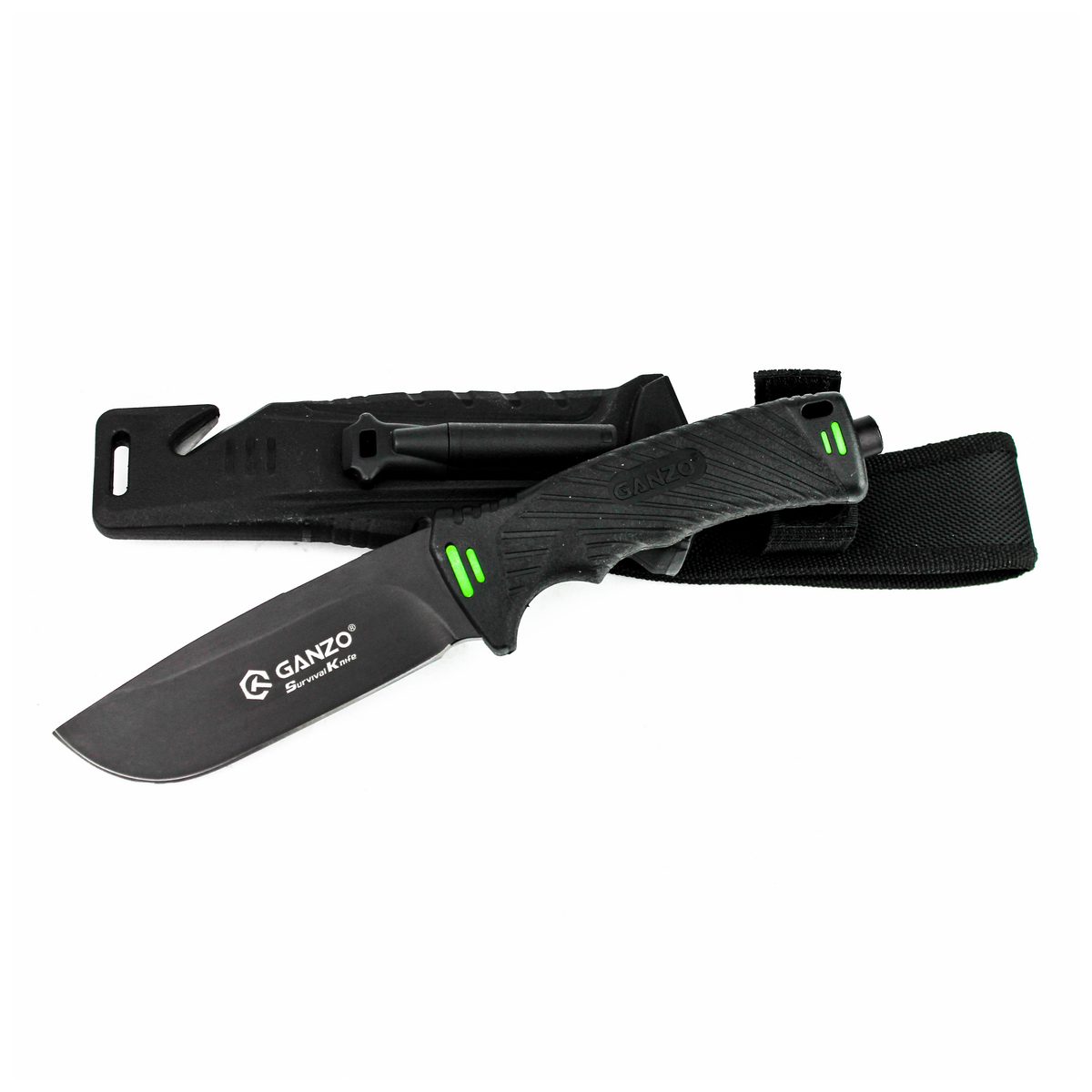 В одному стилі з ручкою виготовлені і піхви для Ganzo G8012. Вони можуть кріпитися на поясі або ж бути прибраними в рюкзак. Виготовлені піхви з пластикових, а також нейлонових елементів. Вони повністю закривають лезо ножа і частково рукоятку. Також в піхви можна протягнути шнур для кріплення на рюкзаку та страхування від втрати ножа. З боку клинка, в піхви вбудований гострий стропоріз з двох перехрещених лез, з допомогою якого можна розрізати мотузки в екстреній ситуації. Якщо ж під час поїздки наприроду знадобиться підточити ніж, автори цієї моделі пропонують скористатися вбудованою в піхви алмазної стругачкою. Вона підходить для гладко заточеного ділянки клинка. Ще один додатковий аксесуар — це кресало, вынимающееся з піхов. На додаток до всього, в рукоятці ножа розміщений склобій — невеликий елемент в торцевій частині ручки, про призначення якого говорить його назва.