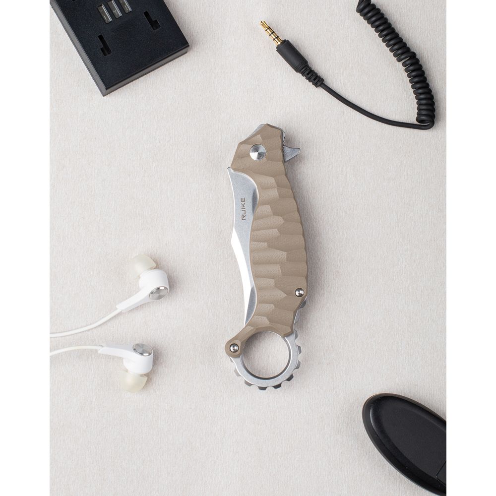 Це можна віднести і до новинки Ruike P881-W. Складаний керамбит має темно-бежевий колір рукояті і довжину в розкритому вигляді 20,2 сантиметри. Забарвлення ножа неоднорідне, з малюнком. Модель має зручну металеву кліпсу, яка дозволяє кріпити ніж на одяг або, приміром, на рюкзак. У виробу є цілий підшипник і замок за типом Liner lock. Цей замок захищає ніж від випадкового відкриття або випадкового закриття. Дуже безпечний і надійний механізм, який значно спростив використання ножів. В результаті відкривати і закривати модель можна буквально однією рукою.