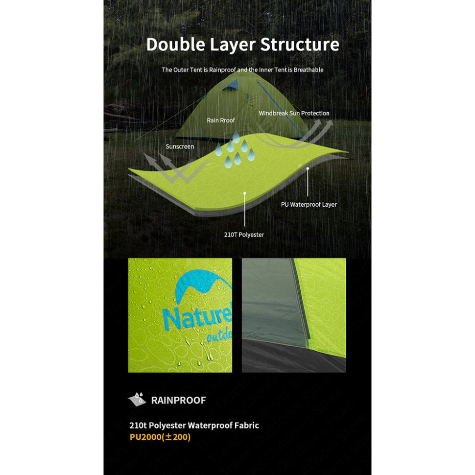 Намет двомісний для туризму, активного відпочинку. Просто та швидко встановлюється, ефективно пропускає повітря, всередині є гачок для підвішування лампи. Форма намету – півсфера. Двошарова конструкція.