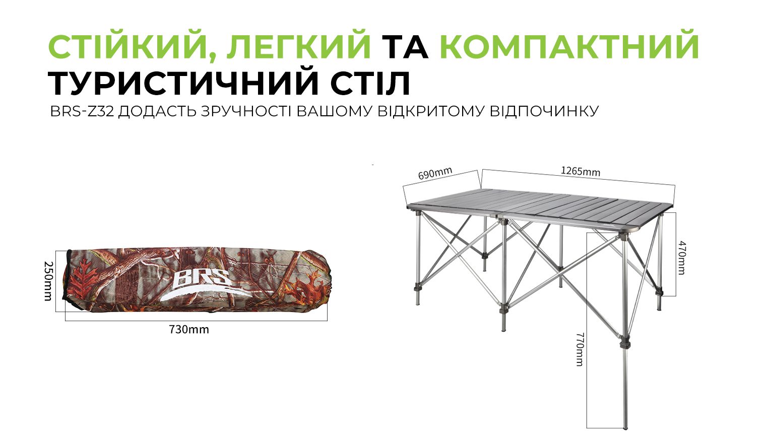Стіл BRS-Z32 призначений для використання на відкритому повітрі та дозволяє з комфортом облаштувати місце для приймання їжі на численну групу людей. Модель складається з двох частин: каркасу та стільниці. Обидві мають складану конструкцію та виготовлені з легкого алюмінієвого сплаву, що не піддається іржавінню та витримує інтенсивні механічні навантаження, включаючи падіння з висоти та вплив людської ваги.
