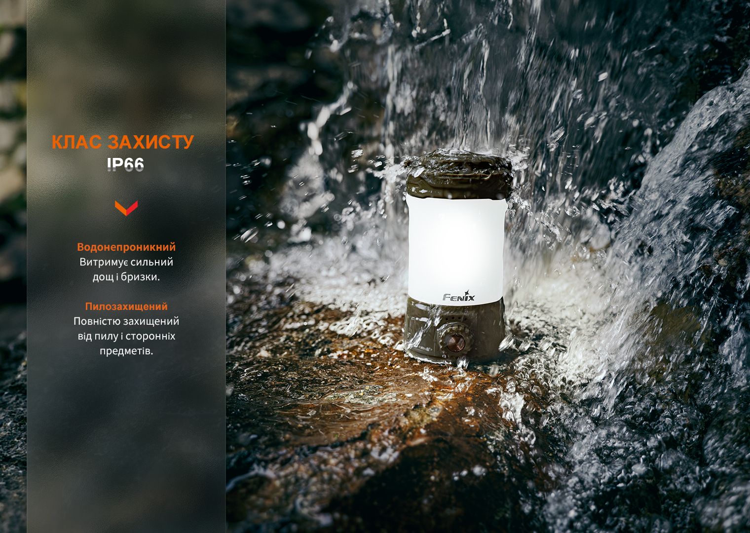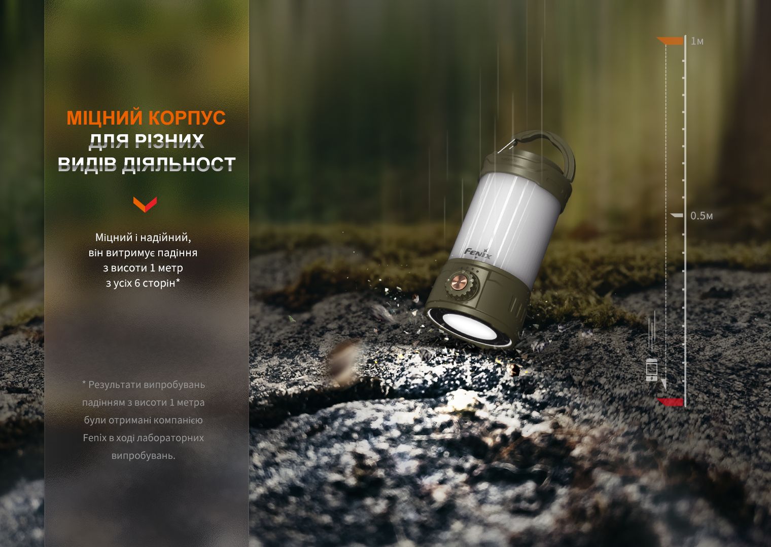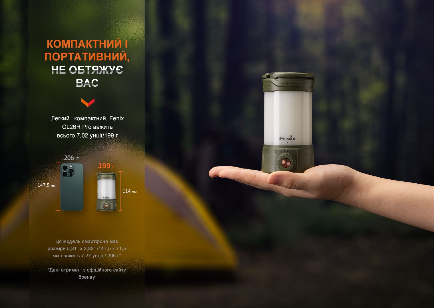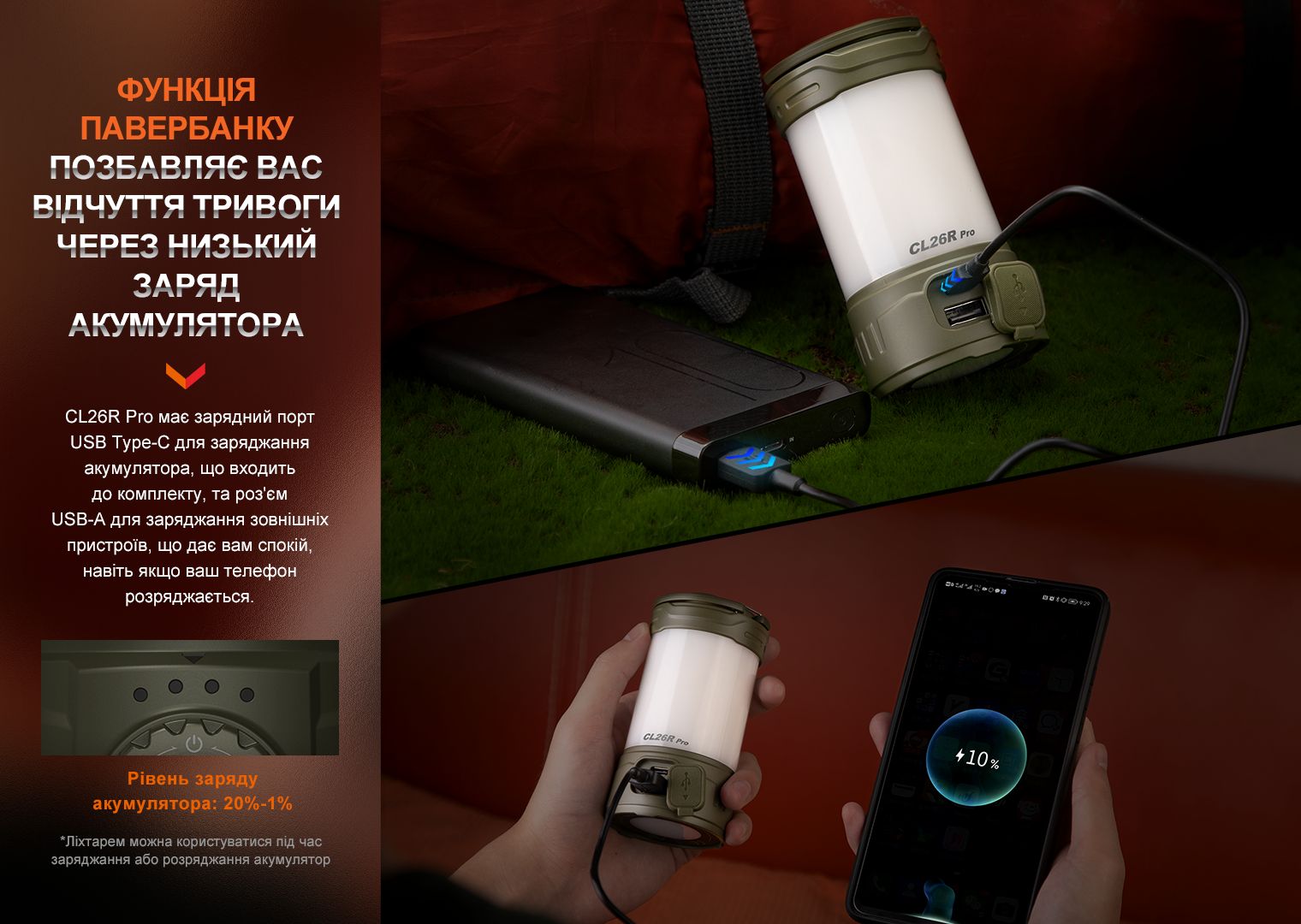 Ліхтар Fenix CL26R Pro — функціональний супутник під час відпочинку на природі. Варіативність використання моделі дозволяє облаштувати місце для відпочинку на основі особистих потреб та уподобань: ліхтар здатний світити як на 360°, так і лише вниз, а червоне світіння перетворює його на нічник, що дозволяє мандрівнику розслабитися перед відходом до сну.