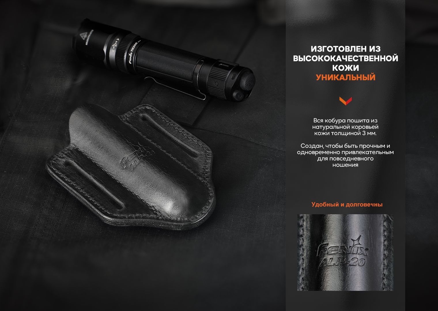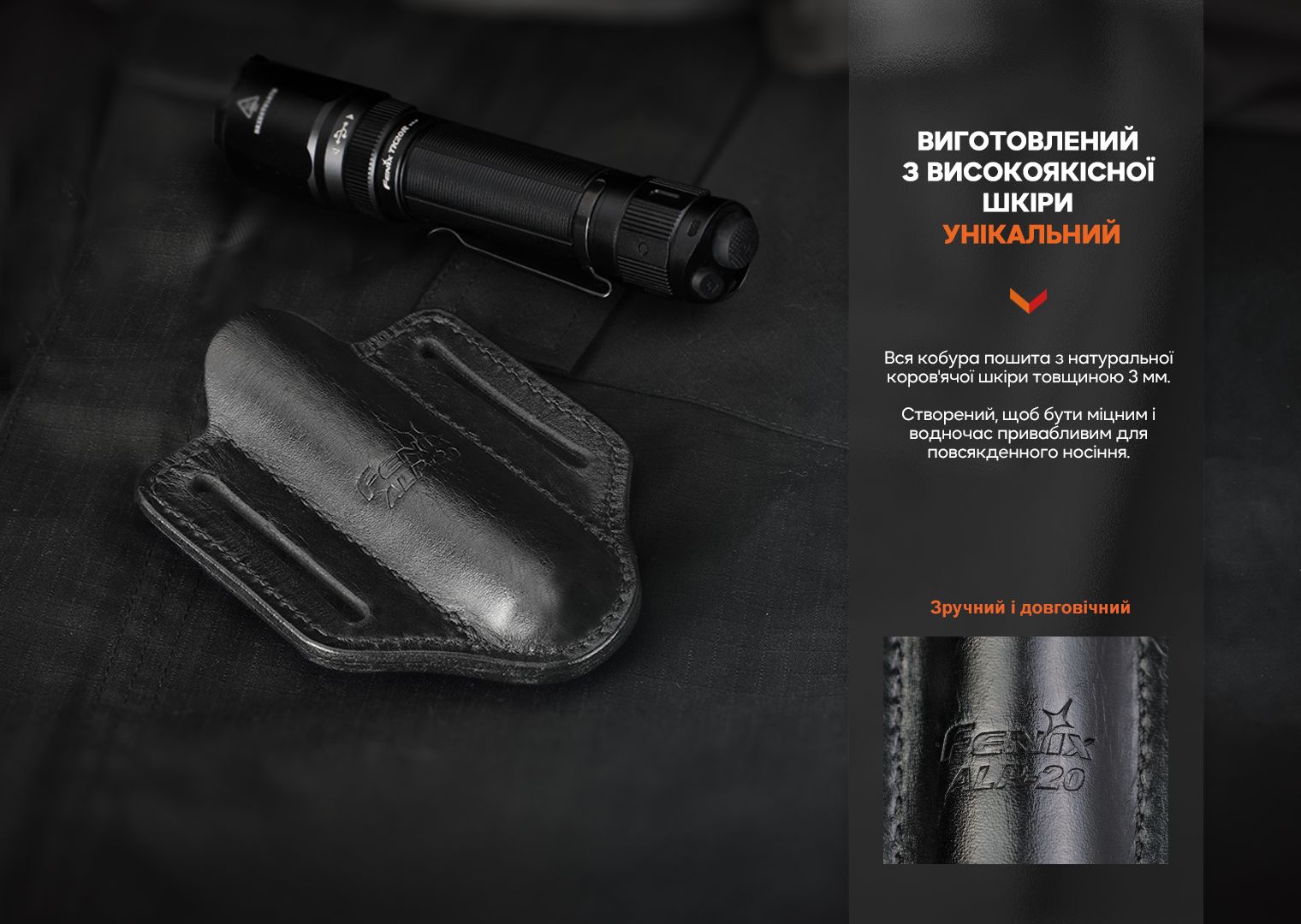 Чохол Fenix ALP-20 розроблений таким чином, щоб щільно утримувати ліхтар усередині, запобігаючи випадковому натисканню тактичних перемикачів у хвості або випаданню пристрою під час активного руху користувача.