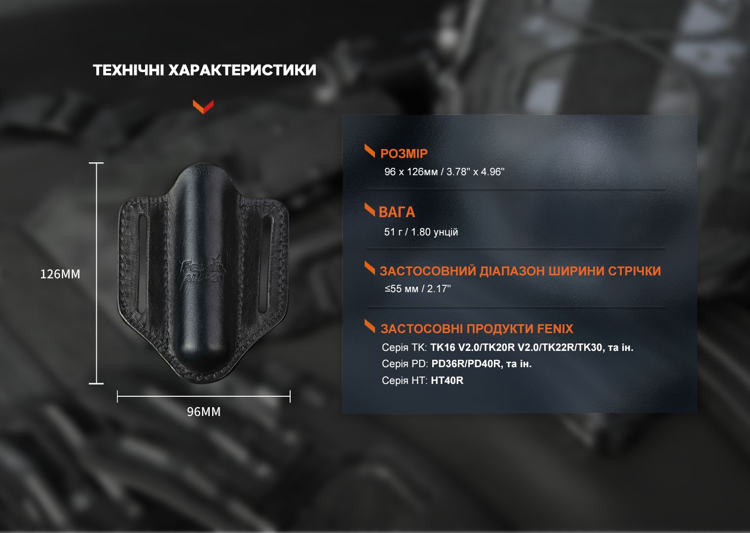 Фіксація освітлювального пристрою у вертикальному положенні робить експлуатацію зручною як для правші, так і для шульги, а відкритий дизайн дозволяє швидко дістати й використати ліхтар. Чохол підходить для кріплення на ремені завширшки ≤55 мм.
