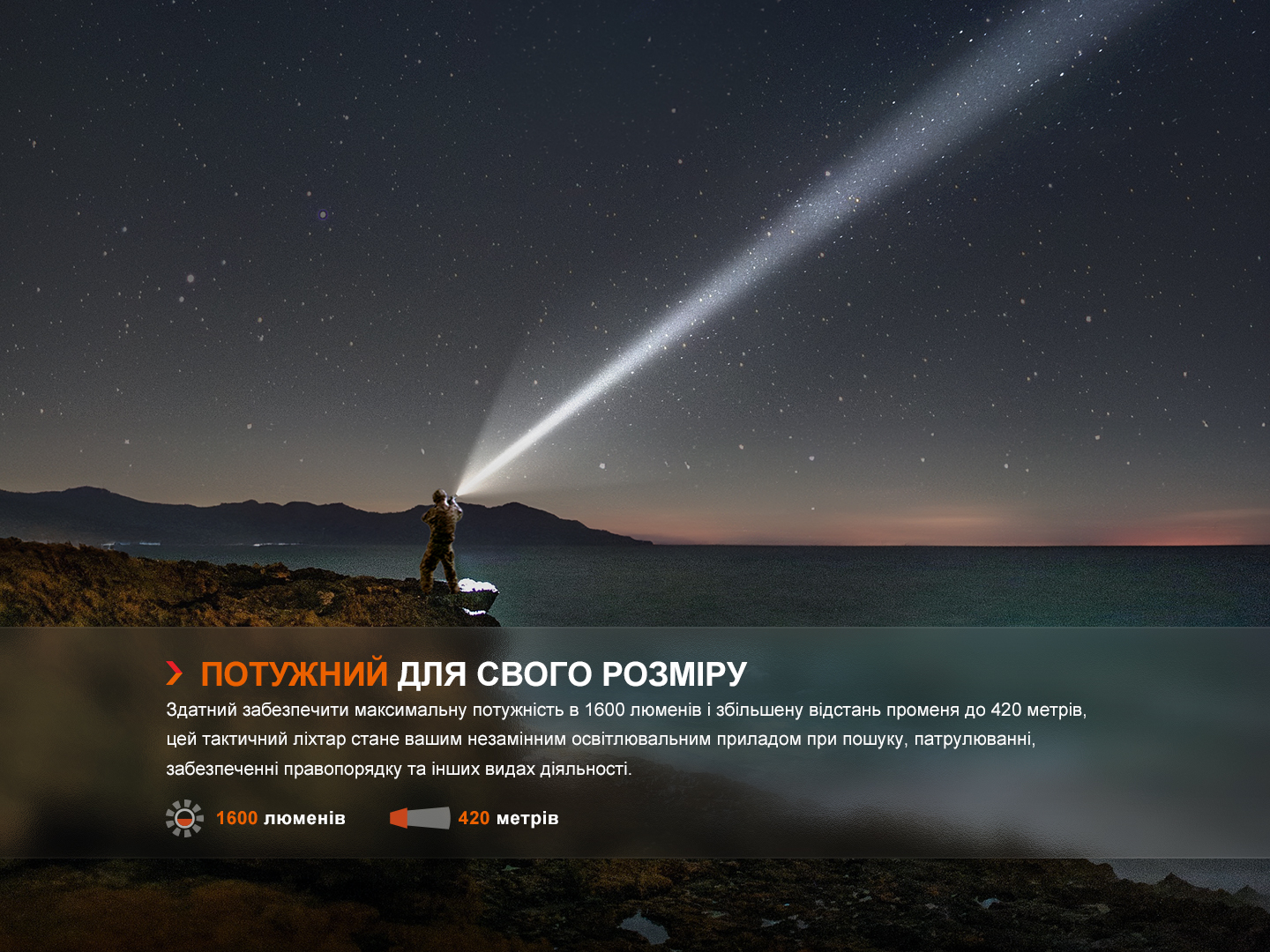 Глибокі ребра в голові корпусу відводять тепло, що накопичується під час тривалої роботи ліхтаря, а ребриста накатка забезпечує міцне утримання.