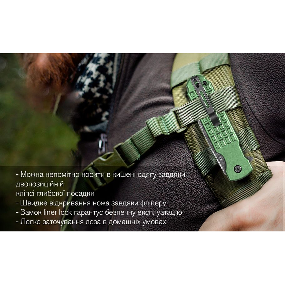 Складана модель Ganzo G627 — це універсальний ніж, який можна непомітно носити в кишені одягу завдяки двопозиційній кліпсі глибокої посадки. Інструмент також можна застосовувати в польових умовах: на риболовлі, пікніку або під час туристичної подорожі, де від наявності гострого ножа залежить комфорт користувача.
