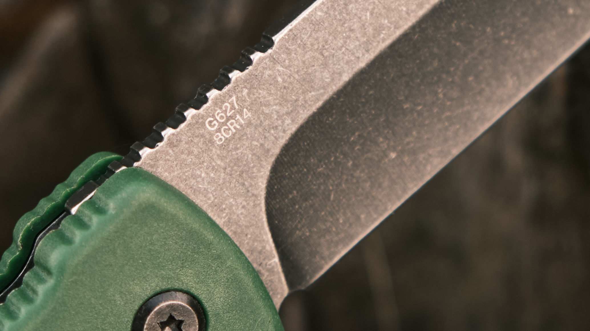 Клинок виготовлений зі сталі 8CR14 з чорним покриттям. Метал демонструє високу опірність до корозії, тому не вимагає спеціального догляду. Твердість марки знаходиться на рівні ±58 HRC, витримуючи баланс між міцністю та легкістю у заточуванні, яке можна виконати в домашніх умовах з використанням звичайних абразивів.