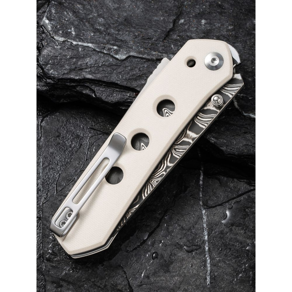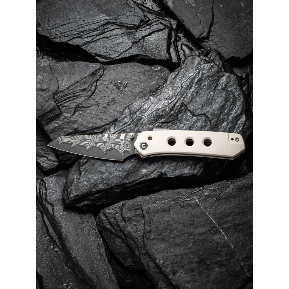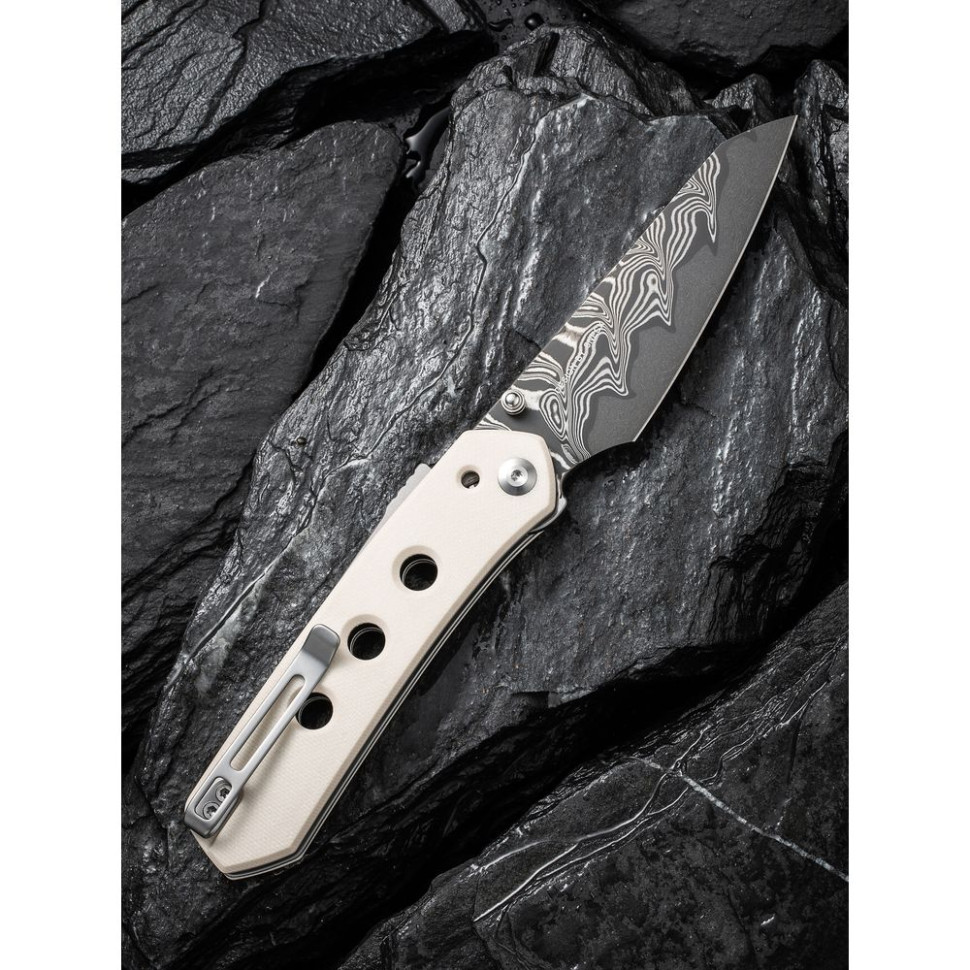 Довжина клинка становить 89.9 мм, а його товщина в обуху дорівнює 3 мм. Клинок виготовлений з висококласної дамаської сталі твердістю близько 58-60 HRC. Метал легко справляється з різанням матеріалів різної щільності — від картону і харчових продуктів до пластику і деревини. Крім того, дамаск демонструє непогану корозійну стійкість і, звичайно, має унікальні візерунки на поверхні, які служать неповторною прикрасою загального дизайну конструкції.