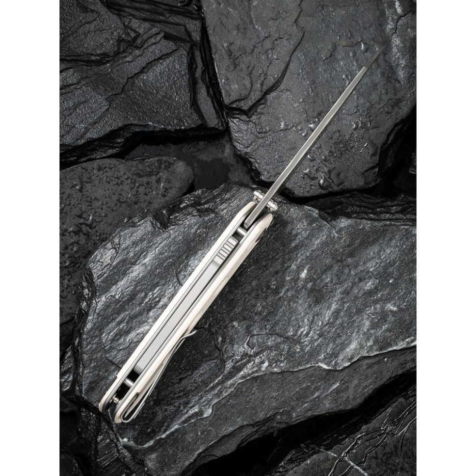 Щоб відкрити клинок, достатньо натиснути на двосторонній шпеник. Лезо рухається з граничною плавністю — для цього в осьовому вузлі передбачені керамічні кульковальники.