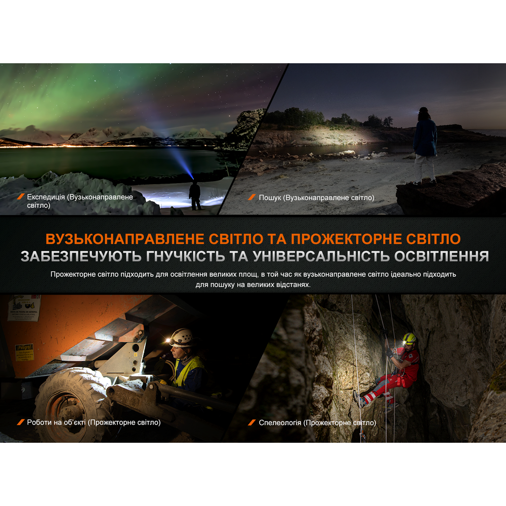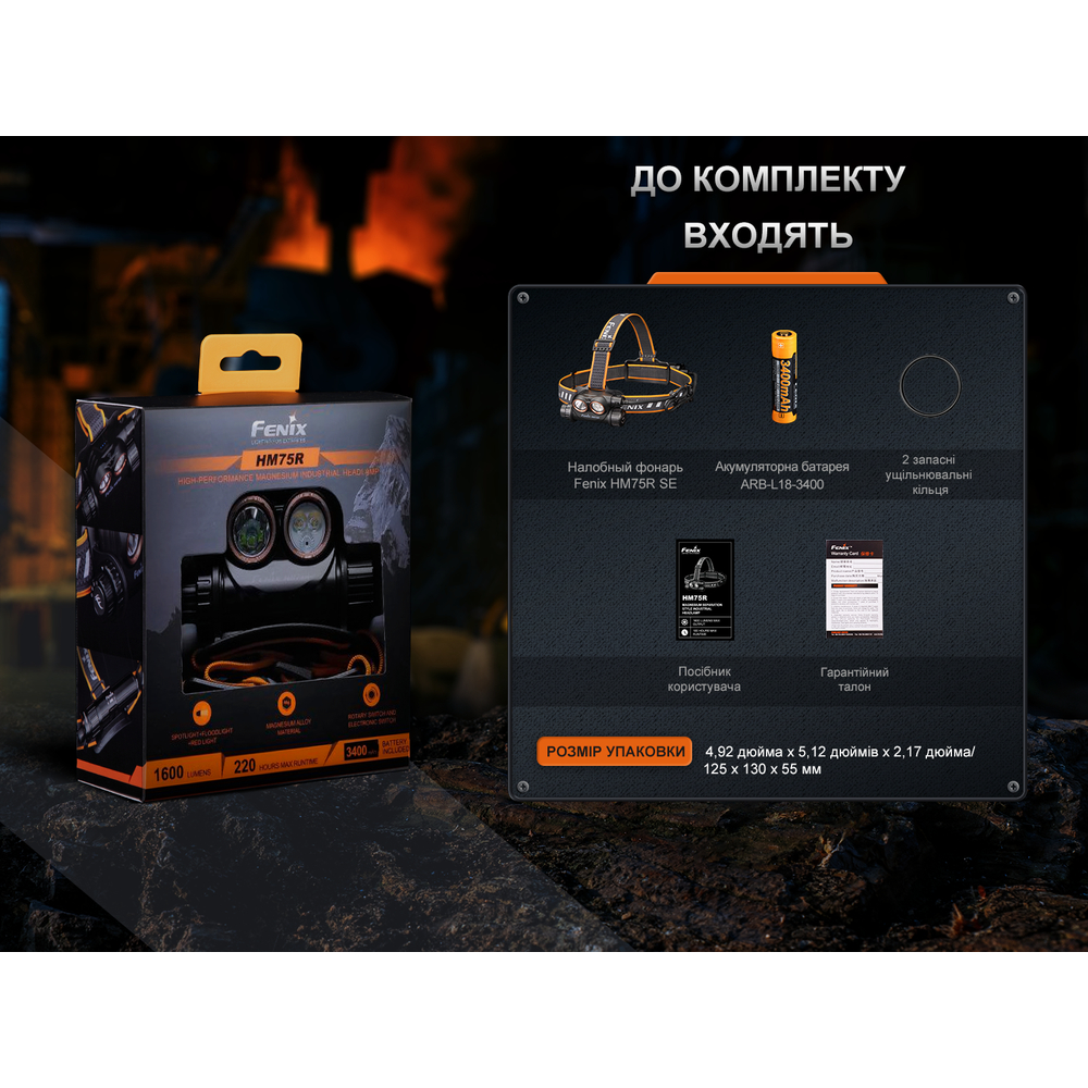 Ліхтар Fenix HM75R з налобним кріпленням, li-ion акумулятор ARB-L18-3400, зарядний кабель USB Type-C, запасне ущільнювальне кільце, гарантійний талон, інструкція користувача.