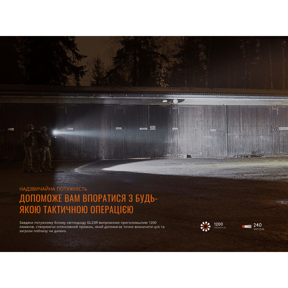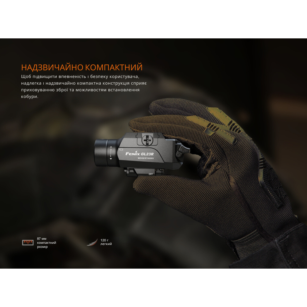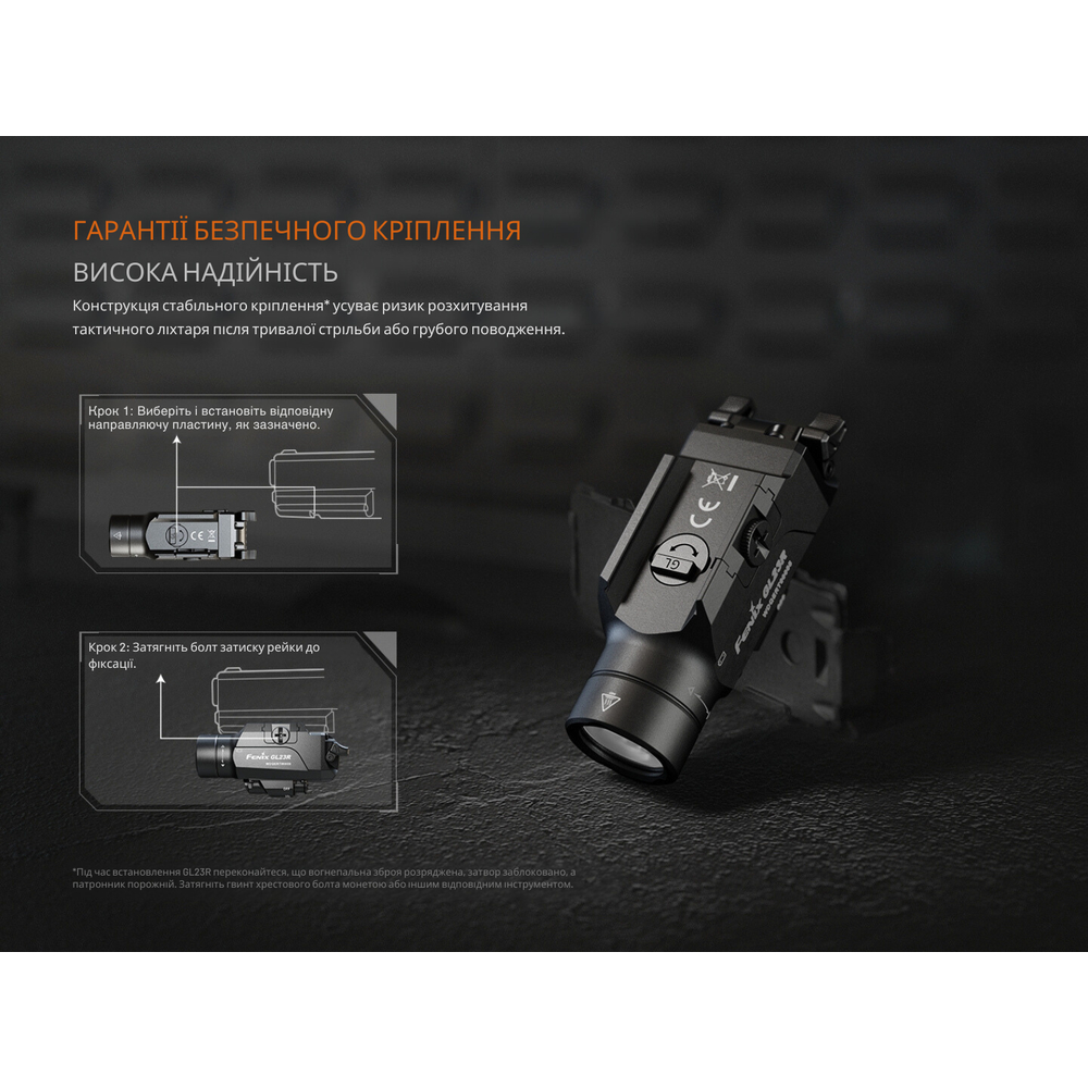 Пістолетний ліхтар Fenix GL23R — це універсальна модель, яку можна використовувати для підсвічування окремих об'єктів та точного прицілювання під час виконання службових та тактичних завдань. Ліхтар підходить для встановлення на більшість повнорозмірних пістолетів із планкою GLOCK® або MIL-STD-1913 (Пікатінні). Для цього у комплектації передбачені відповідні кріплення.