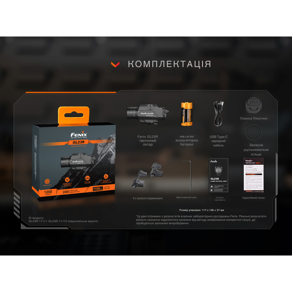 Ліхтар Fenix GL23R, акумулятор ARB-L18-1100 та зарядний кабель USB Type-C, 4 змінних перемикачі, запасне ущільнювальне кільце, кріплення на планку Пікатінні та Glock, шестигранний ключ, інструкція користувача, гарантійний талон.