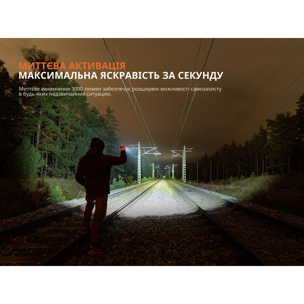 Робоча напруга Fenix WF25RM становить 3,0 В – 4,2 В. Для живлення потрібен один акумулятор 21700. Відповідний елемент живлення ємністю 5000 мАгод є в комплекті.