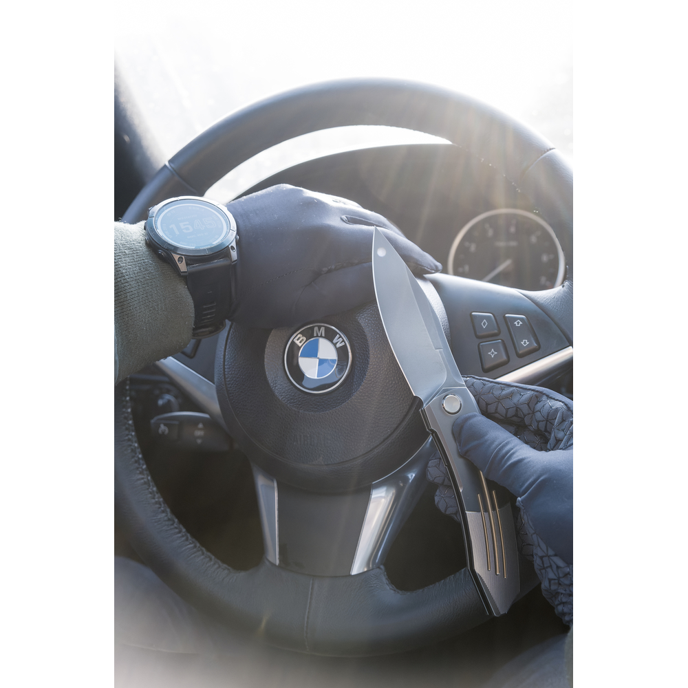 З правого боку руківʼя закріплено однопозиційну титанову кліпсу Deep Carry. Вона призначена для носіння ножа в кишені в положенні Tip-Up (вістрям вгору).
