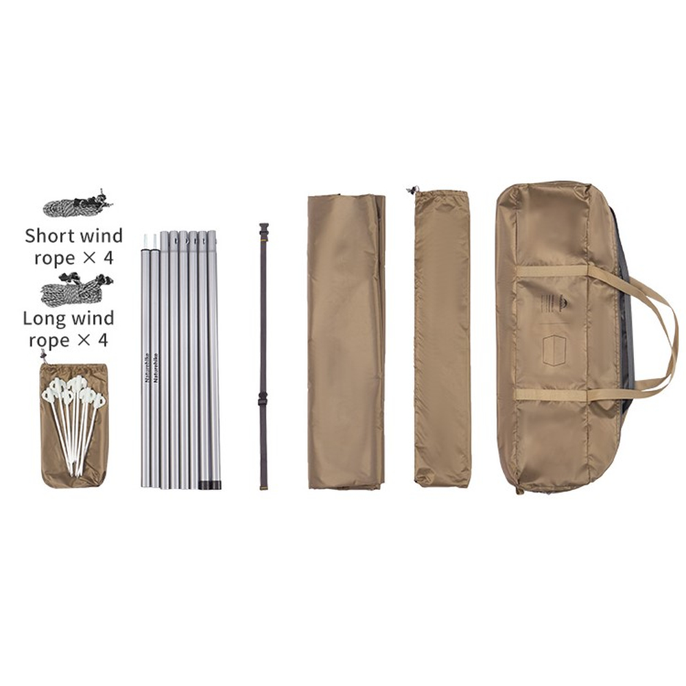 Тент Naturehike CNK2350WS015, стійки (2 шт), короткі вітровідтяжки (4 шт), довгі вітровідтяжки (4 шт), кілочки (8 шт), компресійний ремінь, чохол для кілочків, сумка для зберігання.