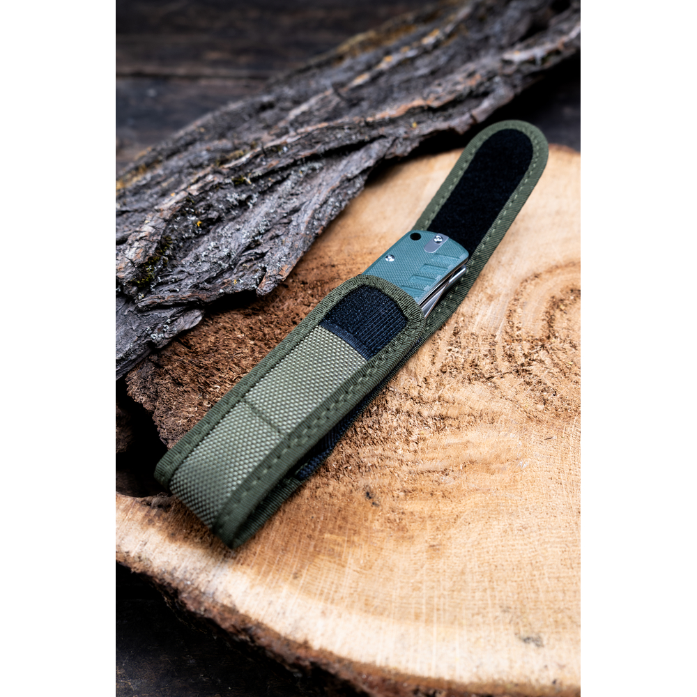 Чохол пошитий з нейлону-матеріалу, відомого міцністю і стійкістю ниток до стирання. Він відмінно переносить ті умови, що характерні для туристичних походів та інших видів активного відпочинку на природі. Розмір чохла по довжині легко регулюється завдяки тому, що застібається він на липучку. Бічні сторони чохла виконані з більш тонкої стропи, а знизу є невеликий відкриту ділянку, в який можна протягнути темляк ножа або ланцюжок для додаткової фіксації ножа, наприклад, на лямці рюкзака. Можливість перенесення інструменту на ремені пояса передбачена і у самого чохла. Ззаду на ньому є спеціальна лямка, пристібається до основи за допомогою кнопки. Таким чином, ніж в чохлі легко повісити на ремінь або зняти, коли це буде потрібно. Крім того, є металеве кільце, за яке чохол також можна підвісити. Загальний розмір чохла становить 23,2 см, але в закритому вигляді він зменшується до 15,2 см.втім, довжину закритого Knife bag можна регулювати, адже він застібається за допомогою широкої липучки. Ширина даного аксесуара становить 3 см.