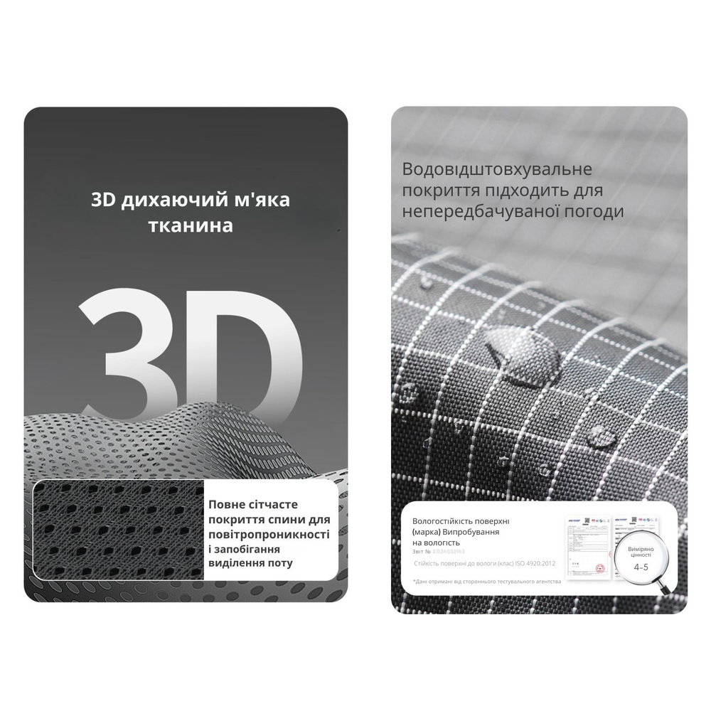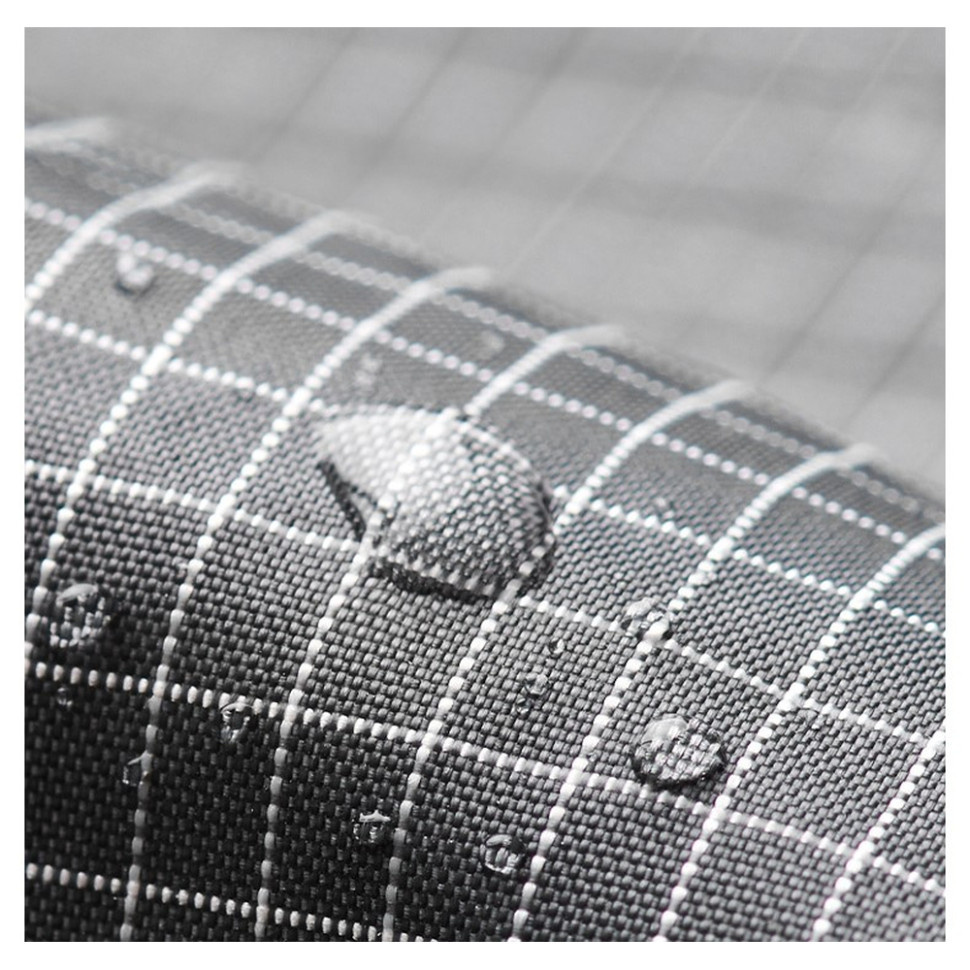 У пошитті використано синтетичну тканину, отриману з перероблених пластикових відходів. З внутрішньої сторони є підкладка з поліаміду. Сітчаста вставка в зоні спинки покращує циркуляцію повітря, щоб шкіра не випрівала під час тривалого носіння рюкзака.