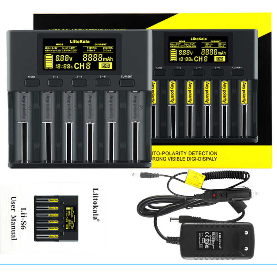 Універсальний зарядний пристрій LiitoKala Lii-S6 EU на 6 каналів + автомобільний кабель обзор