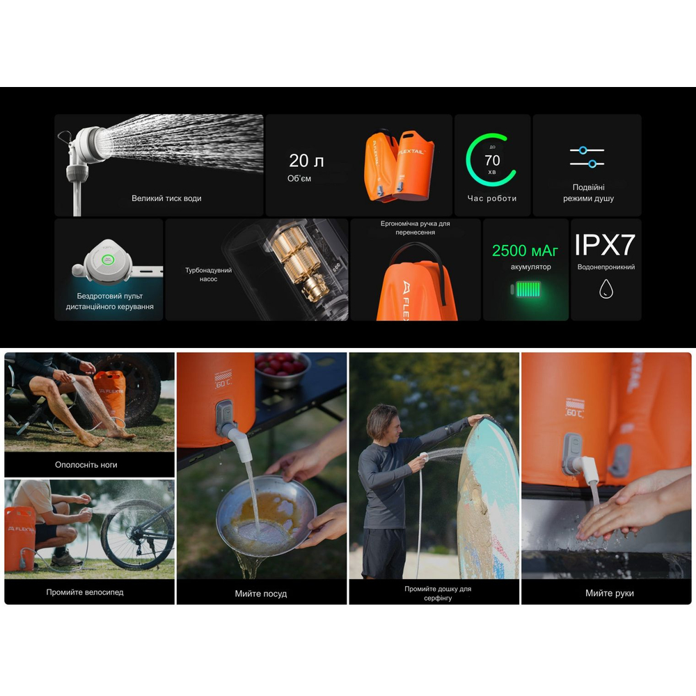 Сучасний портативний душовий контейнер Flextail Tiny Shower Bag з вбудованим електричним насосом розрахований на використання в будь-яких умовах — від автоподорожей і кемпінгу до дачі та пляжу. Вам не потрібні педалі, зовнішні шланги та додаткові ємності — в комплекті є все, що необхідно, включно з 20-літровим герметичним контейнером і душовою лійкою. Достатньо заповнити контейнер водою та натиснути кнопку активації.