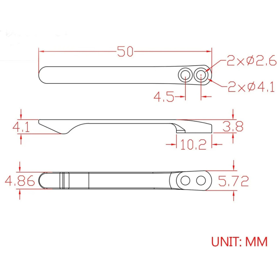Розміри кліпси: 50 мм (довжина) х 4.86 мм (ширина) х 4.1 мм (товщина). У комплекті є пара титанових гвинтів T8 діаметром 4 мм.