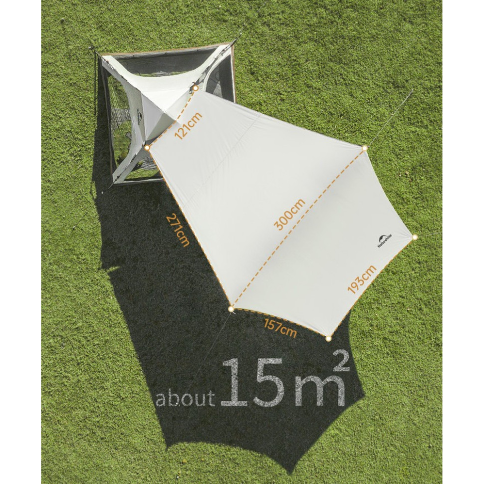У комплекті передбачено багатофункціональний тент, який кріпиться до намету та формує просторий тамбур площею 8.5 м². Цей простір можна використовувати як польову кухню, зону відпочинку в тіні або місце для зберігання спорядження. За необхідності тент можна встановити окремо, наприклад, над обіднім столом або гамаками.
