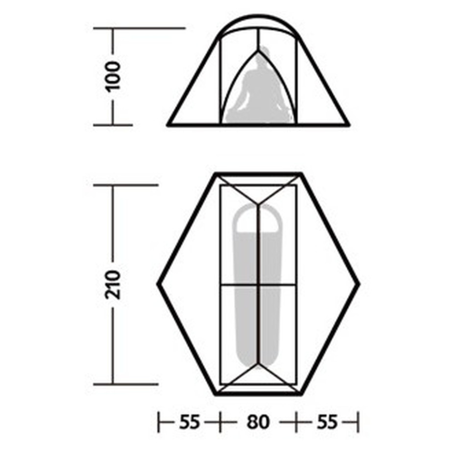 Зовнішній тент з нейлону 15D із силіконовим шаром. Матеріал відрізняється легкістю та стійкістю до механічних пошкоджень. Силікон надає додаткову водостійкість (1500 мм вод. ст.), протистоїть намоканню під час короткочасних опадів, роси та туману.