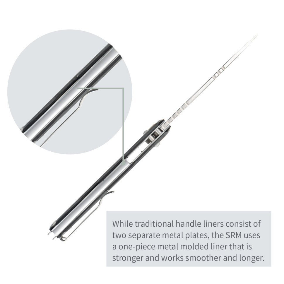 Замок Crossbar Lock замикає клинок поперечним пружним штифтом і однаково зручно керується як правою, так і лівою рукою. У фірмовій модифікації від SRM замок розрахований на однопальцеве розблокування з будь-якого боку руківʼя, що відрізняє механізм від багатьох аналогів.