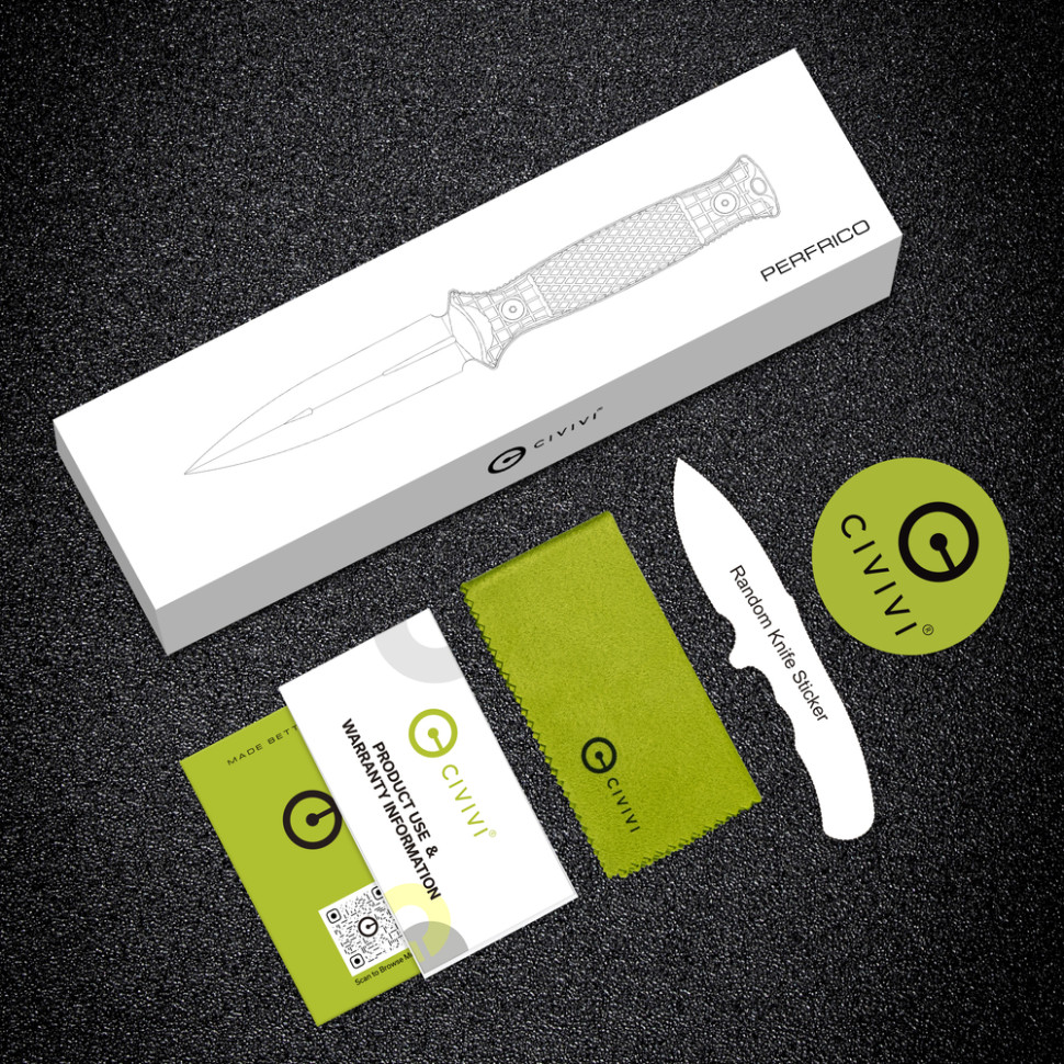 Civivi Perfrico — фіксований ніж кинджального типу з одностороннім заточуванням, який передбачає носіння на поясі завдяки чохлу з комплекту. Галтування з чорним покриттям знижує відблиски, зміцнює клинок і слугує додатковим захисним шаром від корозії.