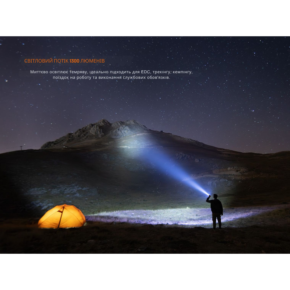 В основі оптики знаходиться світлодіод Luminus SFT25R з колірною температурою ~6500K і загартована ультрапрозора лінза з просвітлюючим покриттям для стабільного, сфокусованого світлового малюнка. Яскравість світла сягає 1300 люменів з дальністю 354 м, що достатньо і для міських завдань, і роботи на відкритій місцевості.