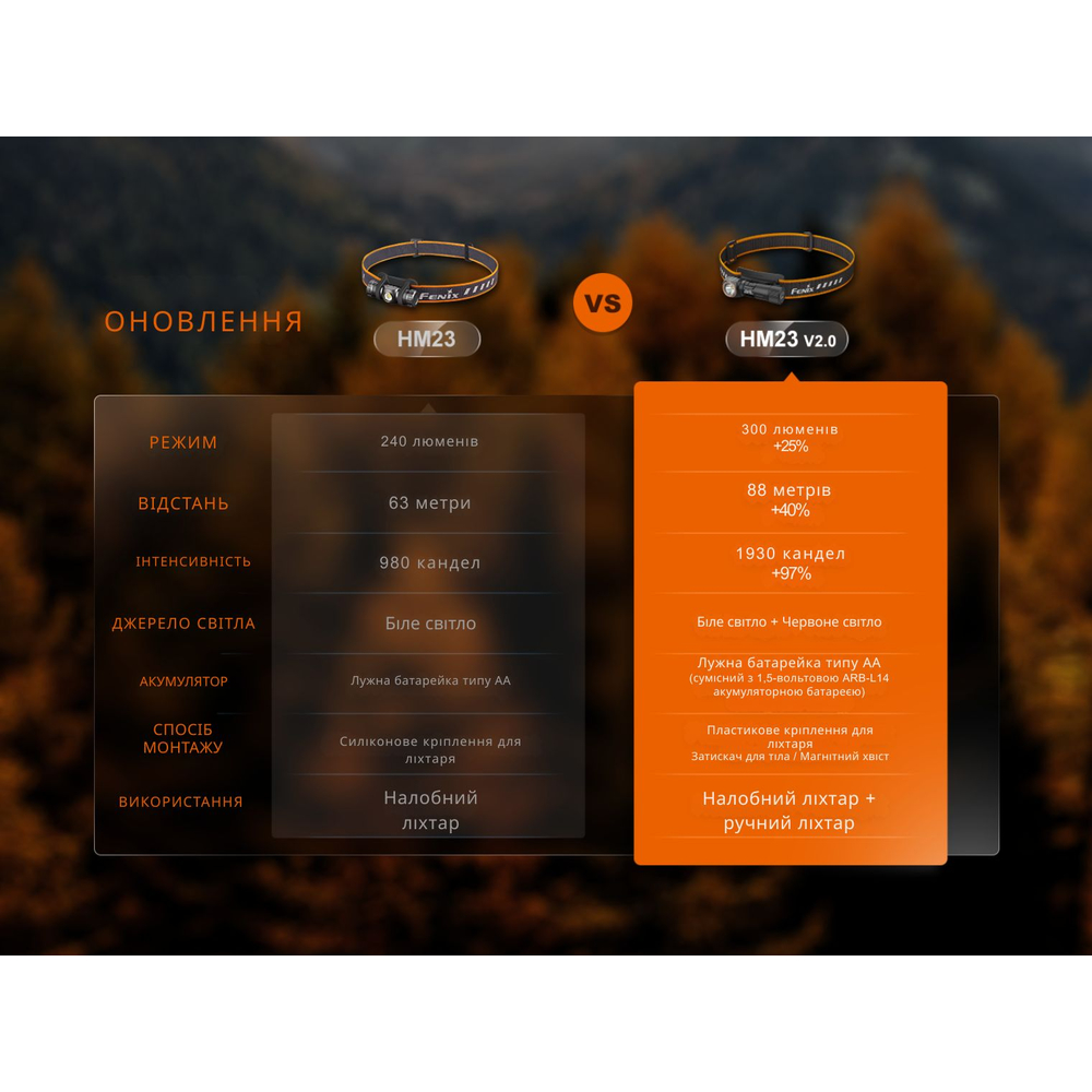 HM23 V2.0 живиться від однієї батареї AA, яка йде у комплекті. Ліхтар також сумісний з перезаряджуваним акумулятором Fenix ARB-L14-U типорозміру 14500 (1.5 В).