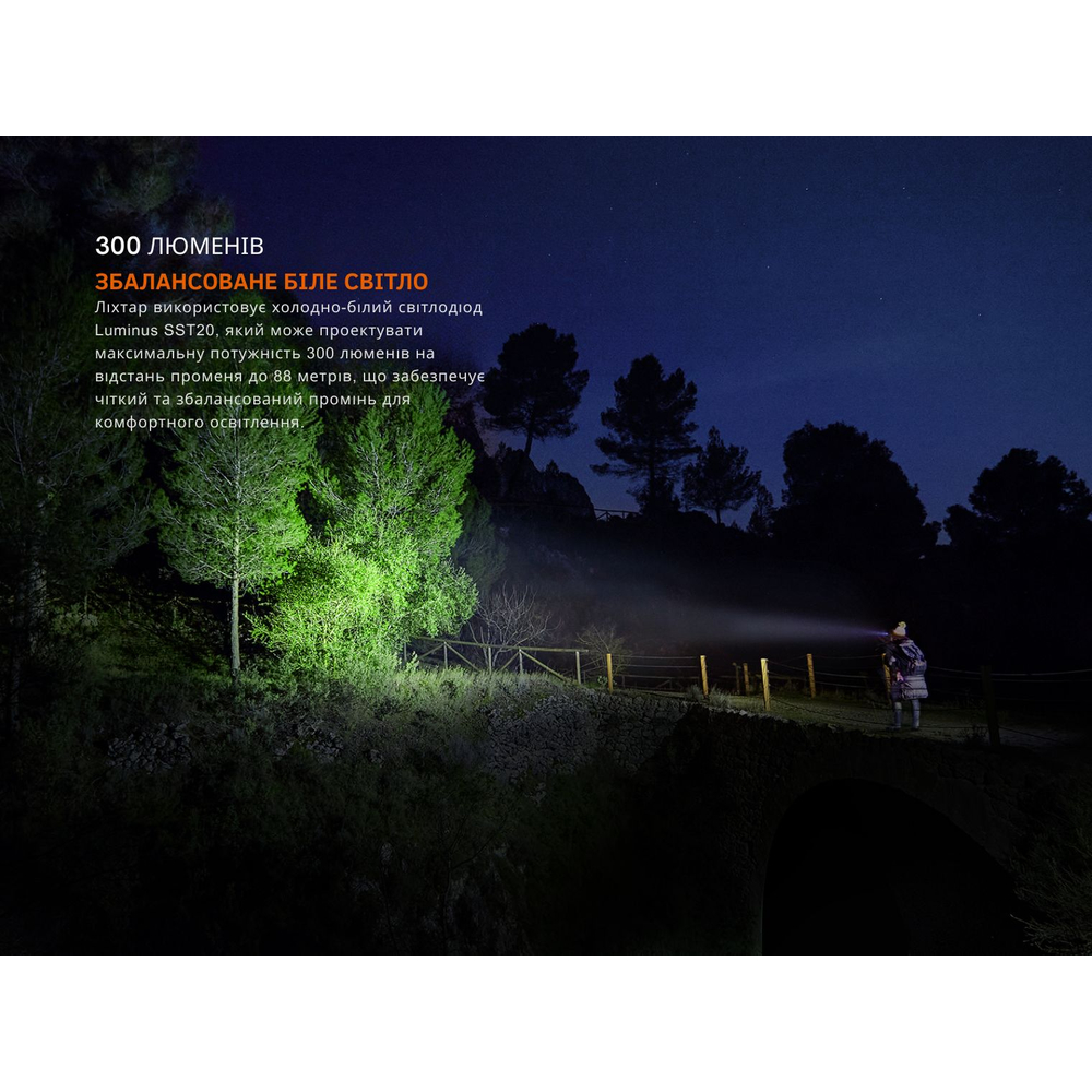 Поєднання одного білого світлодіода Luminus SST20 та двох червоних 2835 робить ліхтар актуальним не тільки для повсякденної експлуатації, а й для професійних тактичних цілей. Біле світло яскравістю до 300 лм (колірна температура 5900–6500К) дає детальне освітлення на дистанції 88 м, а кольоровий червоний промінь забезпечує м'яке підсвічування зі збереженням нічного зору.