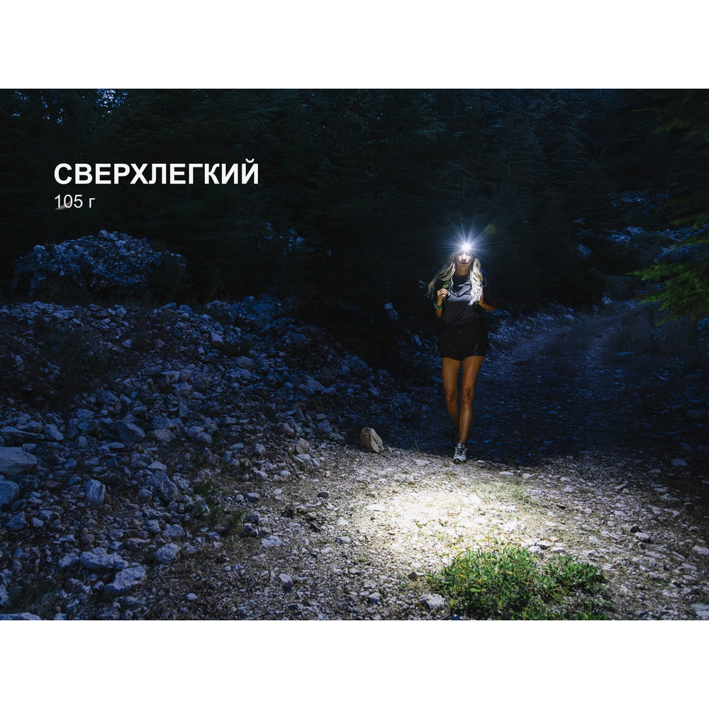 Ліхтар важить 105 г разом з акумулятором та оголов'ям. Налобна резинка має перфорований дизайн для повітропроникності та комфортної посадки на голові без стискання. Ви можете регулювати напрямок променя шляхом нахилу пристрою у кріпленні.