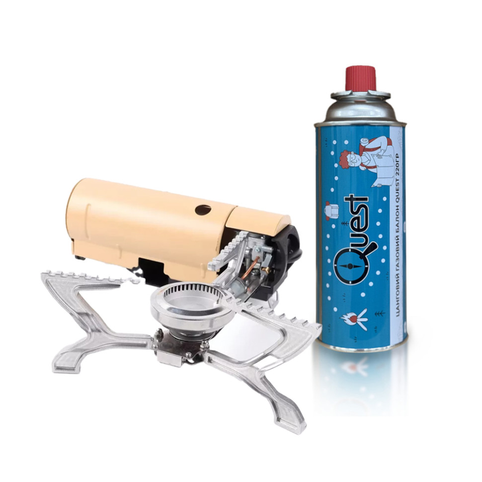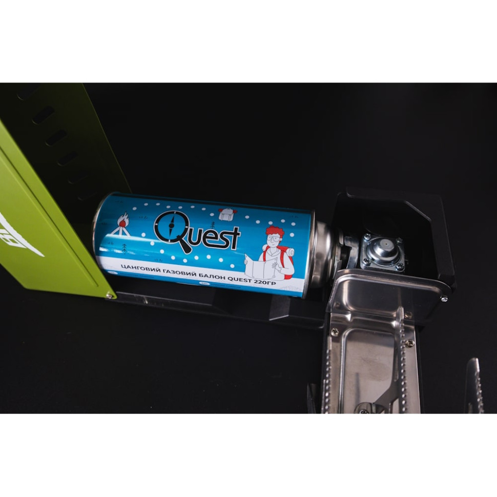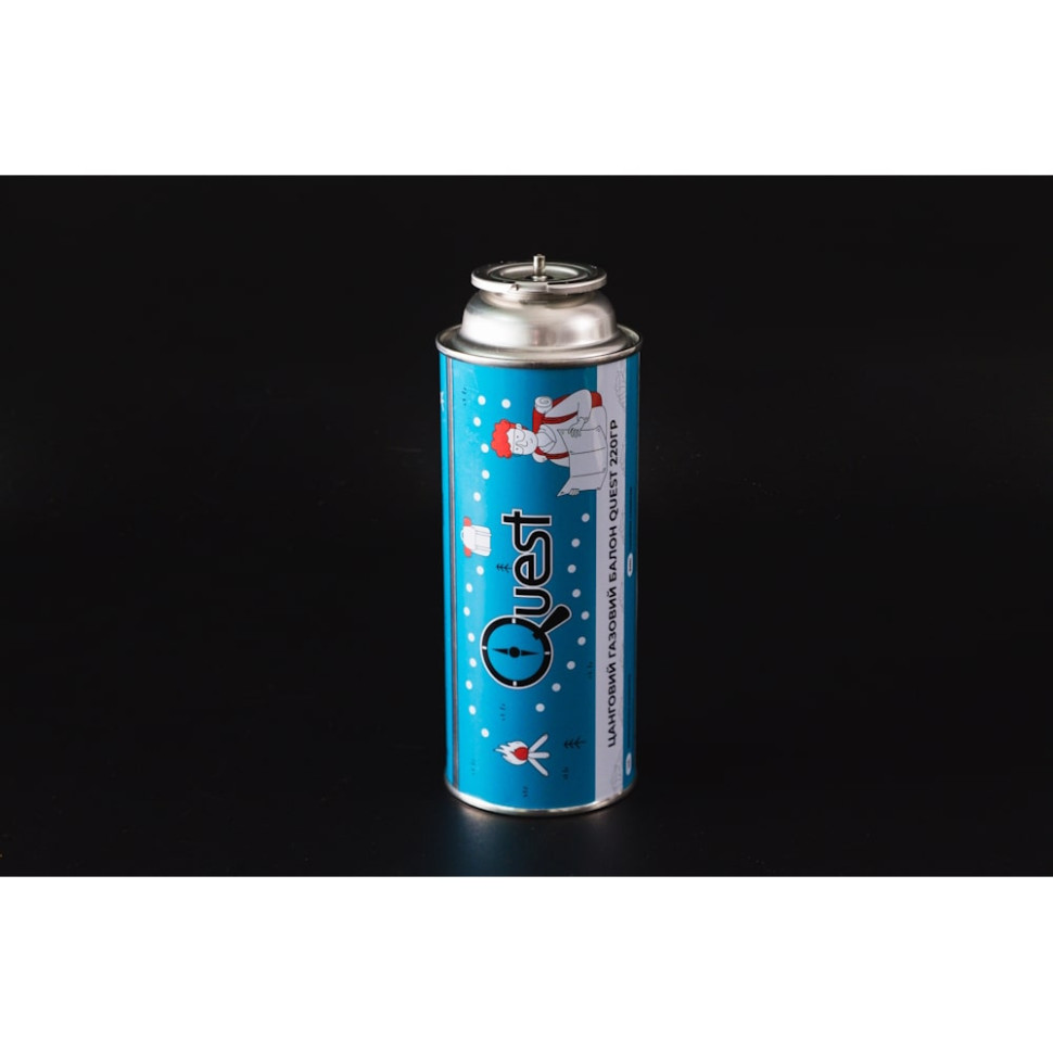 Цанговий балон Quest 220 г заправлений очищеним бутаном, актуальним для використання за температури від -2°C і вище. Корпус виготовлений з надміцного сплаву та гарантує безпеку під тиском.