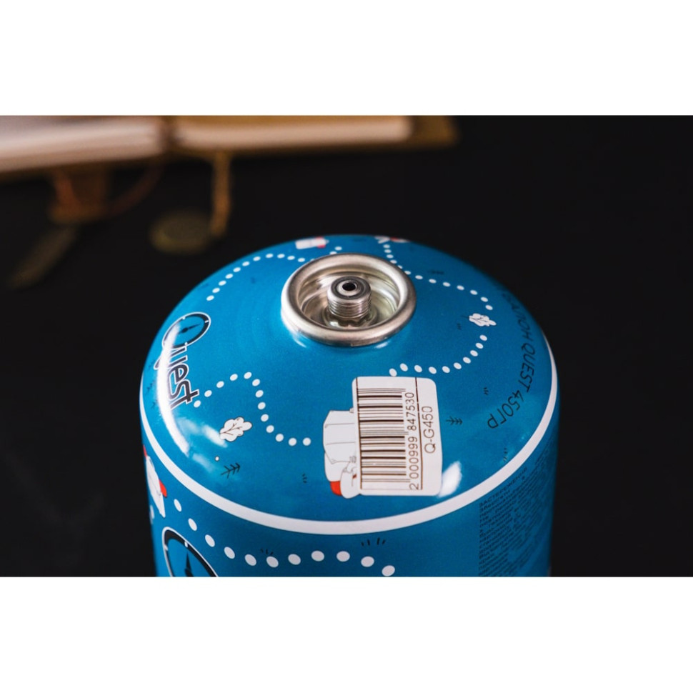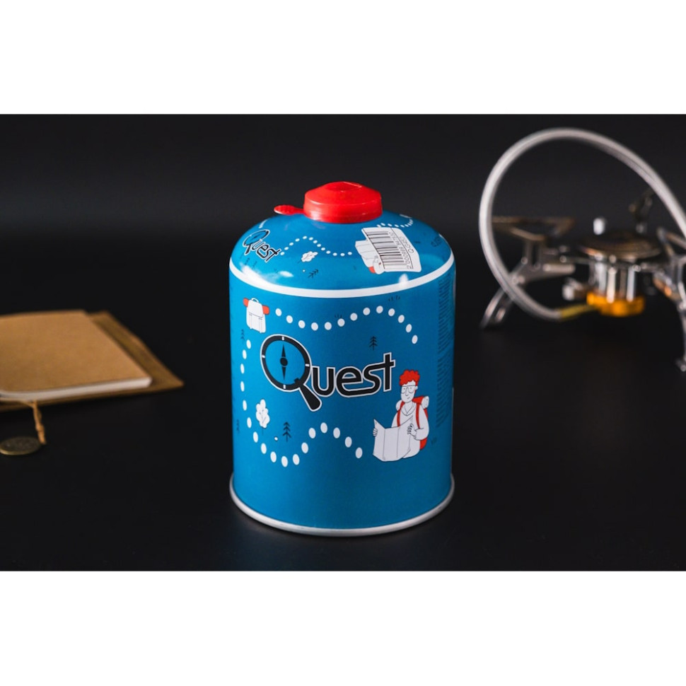 Універсальний балон Quest 450 г наповнений сумішшю пропану, бутану та ізобутану в пропорціях 25/39/36% та забезпечує стабільний тиск за помірних та негативних температур.