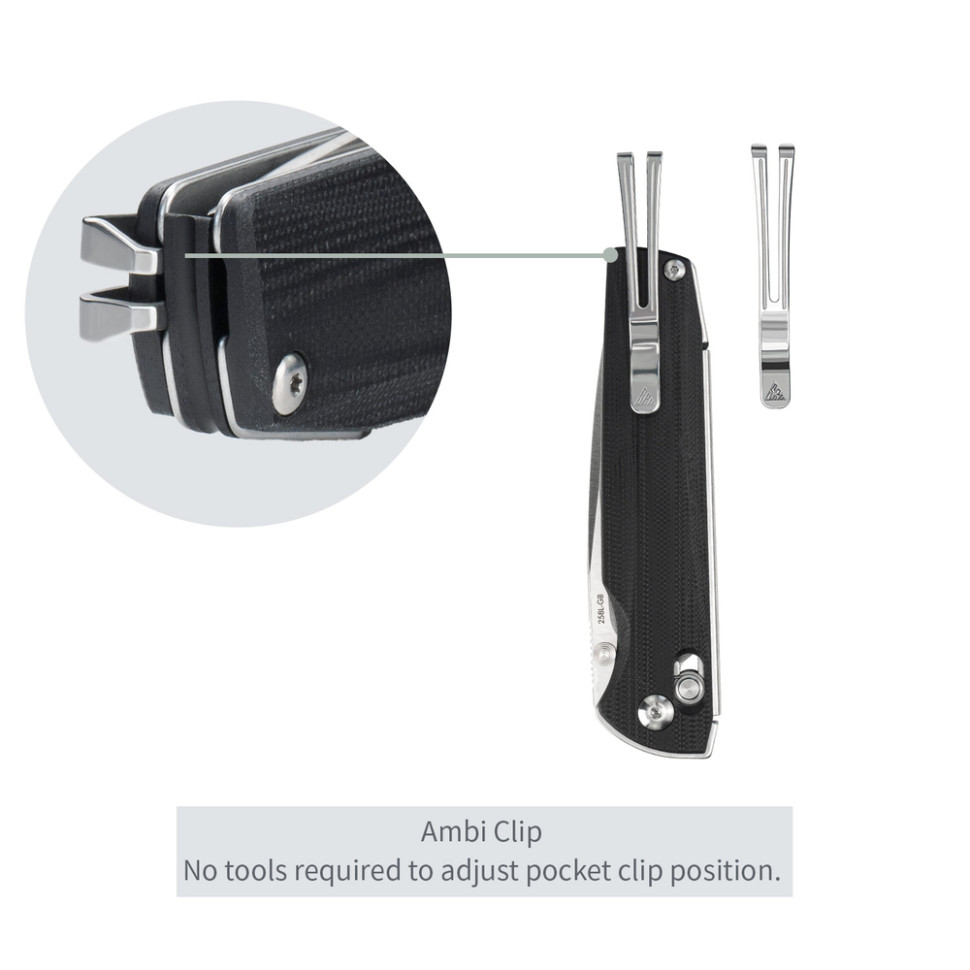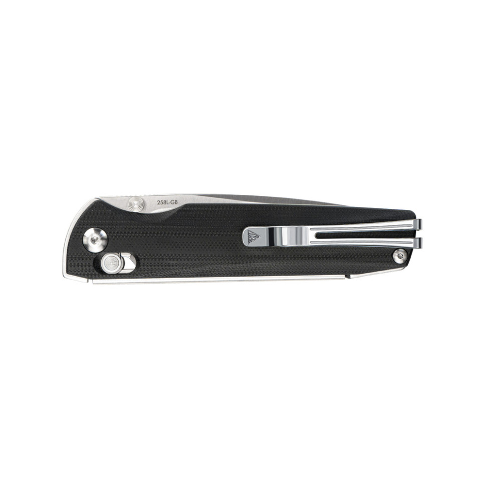 Ніж SRM Terrier 258L-GB має акуратний силует, що робить з різального інструменту стильний аксесуар для повсякденного носіння. Модель можна носити непомітно: сталева кліпса Tip-Up фіксується на кишені, повністю ховаючи ніж. Кліпса передбачає встановлення з правого або лівого боку руківʼя.