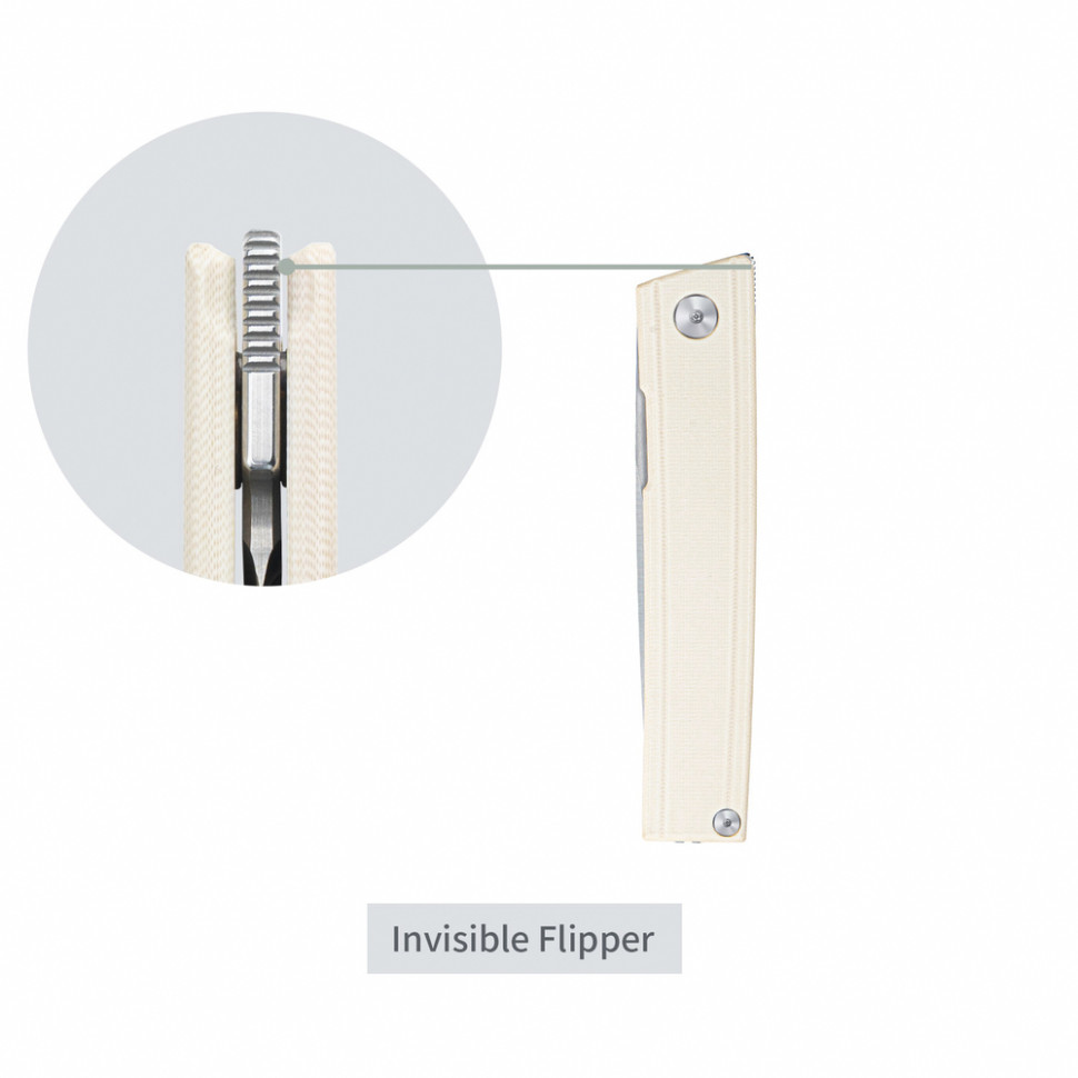 Клинок відкривається натисканням на невидимий фліпер, повністю схований у силуеті. У такий спосіб виступ не чіпляє кишеню та не порушує чисті лінії дизайну. Осьовий вузол працює на сталевих підшипниках, що дають плавний хід леза.