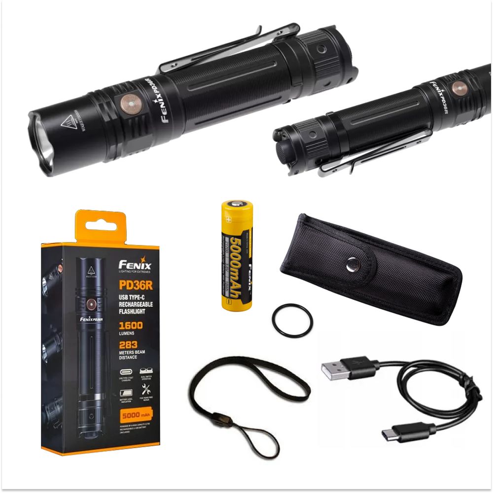 | Комплектація | Ручний ліхтар Fenix PD36R, літій-іонний акумулятор формату 21700arb-L21-5000, темляк для носіння на зап'ясті, тканинний чохол, кабель USB type-C, кільце ущільнювача. | ||||||