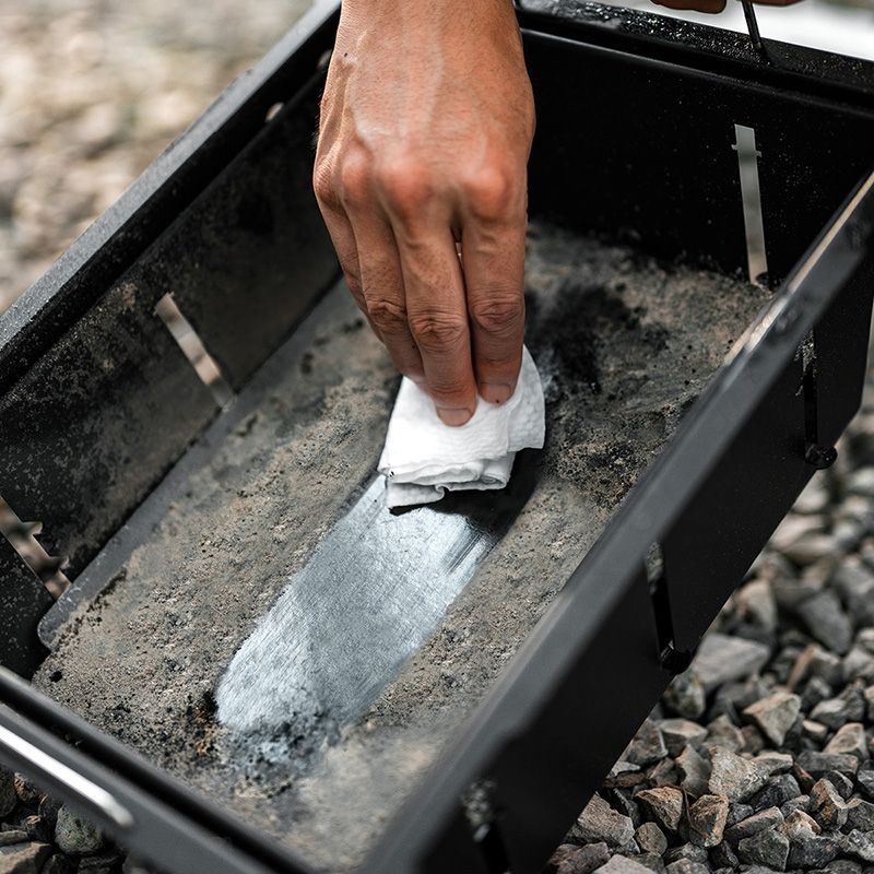 Після того як стіл охолонув і був очищений від кіптяви, залишків їжі та жиру, його можна скласти до розмірів 645 х 405 х 70 мм. У такому положенні тримач для посуду трансформується в ручку, яка полегшує транспортування складеного стола, що важить 6.7 кг.