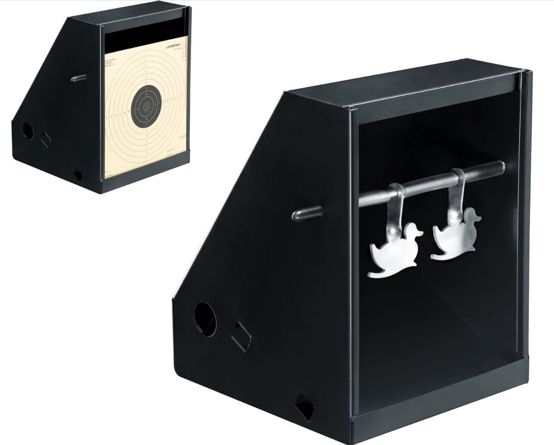 Пулеулавливатель, предназначенный для стрельбы из пистолетов и револьверов мощностью до 7,5 Дж. Идеально подходит для развлекательной стрельбы («плинкинга»). Оснащена четырьмя металлическими мишенями: двумя утками и двумя маятниками диаметром 35 мм. В комплект также входят 10 бумажных мишеней размером 17 × 17 см. Подходит для пневматического оружия мощностью до 7,5 Дж. Размеры: 235 x 175 x 192. Вес: 1670гр. Материал: Сталь.