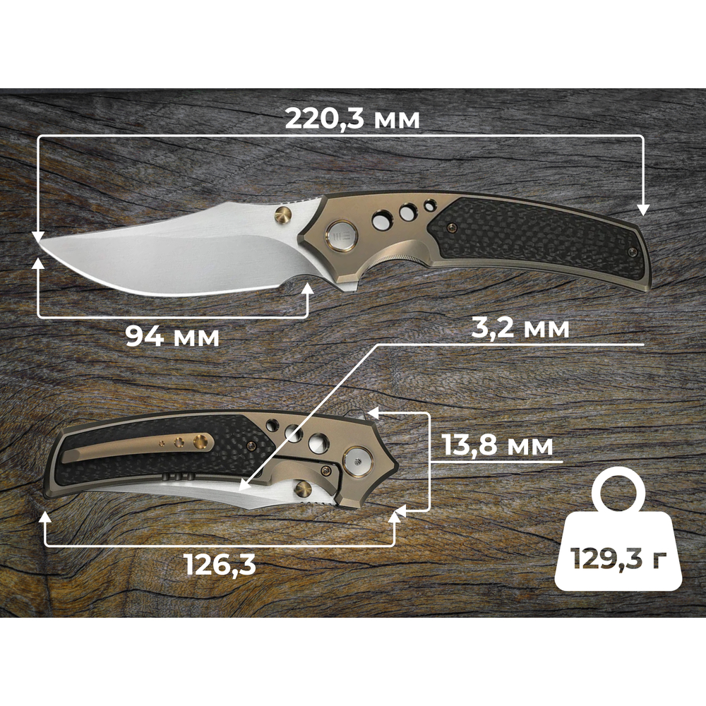 Повна довжина ножа у відкритому стані — 220,3 мм. Уся фурнітура, включаючи гвинти, кліпсу та шпеньок, також виготовлена з титану з золотистим акцентом, що підкреслює преміальний статус моделі. Обертова система осьового вузла та витончена кліпса дозволяють комфортно носити ніж на кишені, роблячи його майже невідчутним завдяки вазі у 129,3 г.