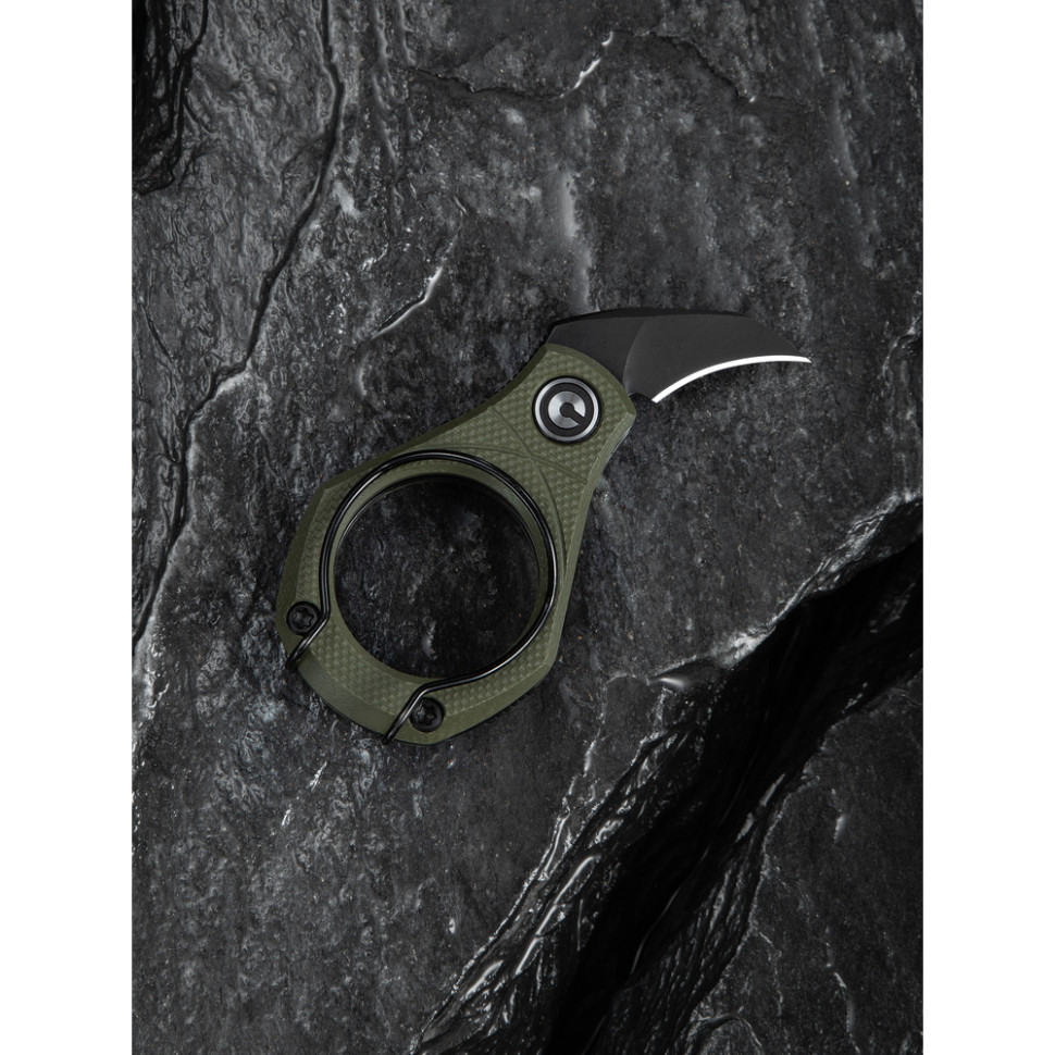 Клинок форми Hawkbill (вигнутий кіготь) має довжину 16,4 мм. Така форма ідеально підходить для розрізання щільних матеріалів. Вигнуте вістря «вгризається» в упаковку, картон або мотузку, не даючи лезу зісковзнути. Товщина обуха становить 2,2 мм, що забезпечує достатню жорсткість для силового натискання під час роботи.