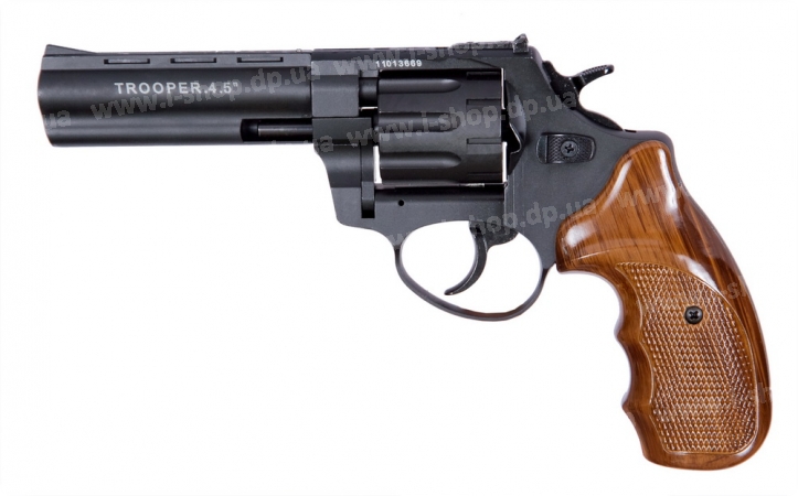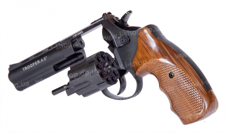 Это идеальный вариант для новичков, поскольку он может помочь отточить навыки обращения с оружием. Основное предназначение – спортивная и развлекательная стрельба. Представленный револьвер имеет превосходную точность стрельбы. Он очень удобен в обращении. Барабан полностью стальной. Рукоять выполнена из высококачественного пластика, которая эргономично размещается в руке и не выскальзывает в процессе стрельбы. Стоит отметить убойную мощь TROOPER-4.5 . Скорость пули на начальном этапе составляет 190м. в секунду, что позволяет максимально точно попадать в мишень на расстоянии 15 метров. Столь большая мощность данного револьвера все также не требует специального разрешения на его использование. Ударно-спусковой механизм выполнен из стали и наделен функцией двойного действия.